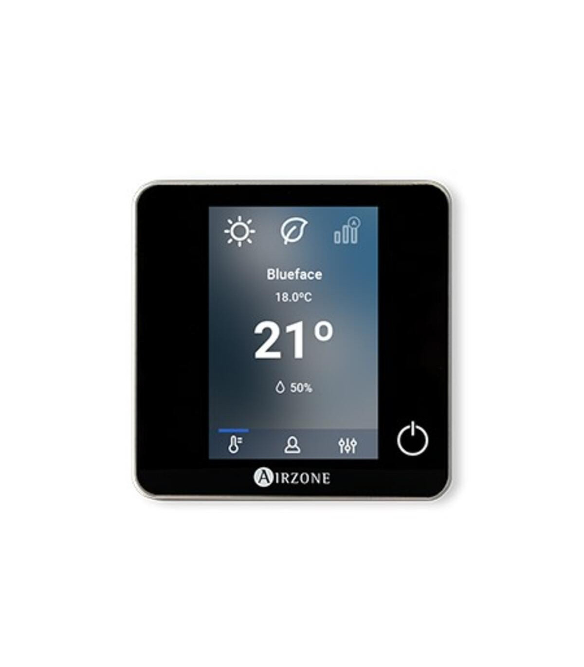 Interfaz gráfico a color con pantalla capacitiva y acabado en acero y cristal, para el control de zona en un sistema Airzone. Alimentado a través de la central del sistema. Disponible en blanco y negro.