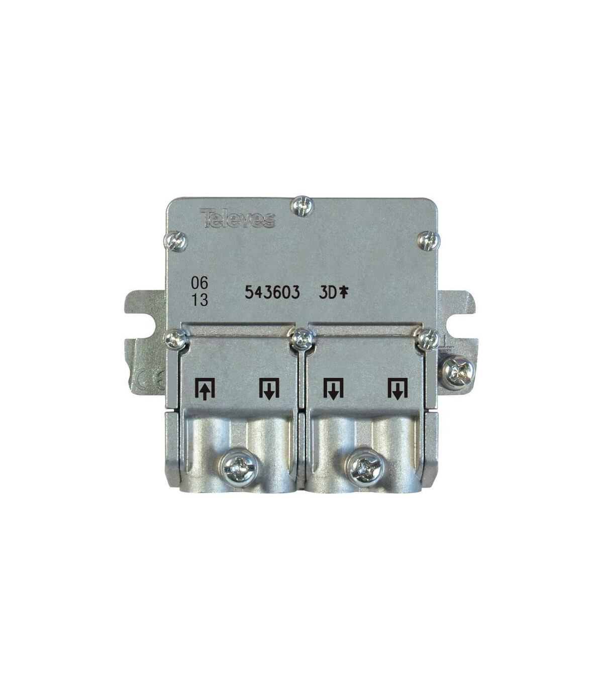 Mini-repartidor EasyF 3D 5...2400MHz 8,5/7,5dB. Repartidor mini de 3 direcciones y sistema de conexión EasyF, para señales de SMATV. Su innovador tamaño ultrarreducido permite su instalación en cualquier parte, incluidos registros de dimensiones reducidas. Además la miniturización se aplica también en la electrónica que incorpora y que mejora su comportamiento eléctrico y reduce el efecto del ruido impulsivo. Es de instalación interior, pero también es apto para exterior siempre dentro de un cofre (ref. 417801). Se suministra en cajas de 10 uds.. Sistema de conexión EasyF: facilidad de instalación y ahorro en el montaje. Fabricado en Zamak, gran blindaje. Gran fiabilidad: fabricación automatizada con microcomponentes de última generación. Mini repartidor 5 vías de la serie EasyF 3D de Televés, diseñado para la distribución de señal de televisión y comunicaciones hasta 2400 MHz. Ofrece una atenuación equilibrada de 8,5/7,5 dB, asegurando una calidad de señal óptima en todas las salidas.