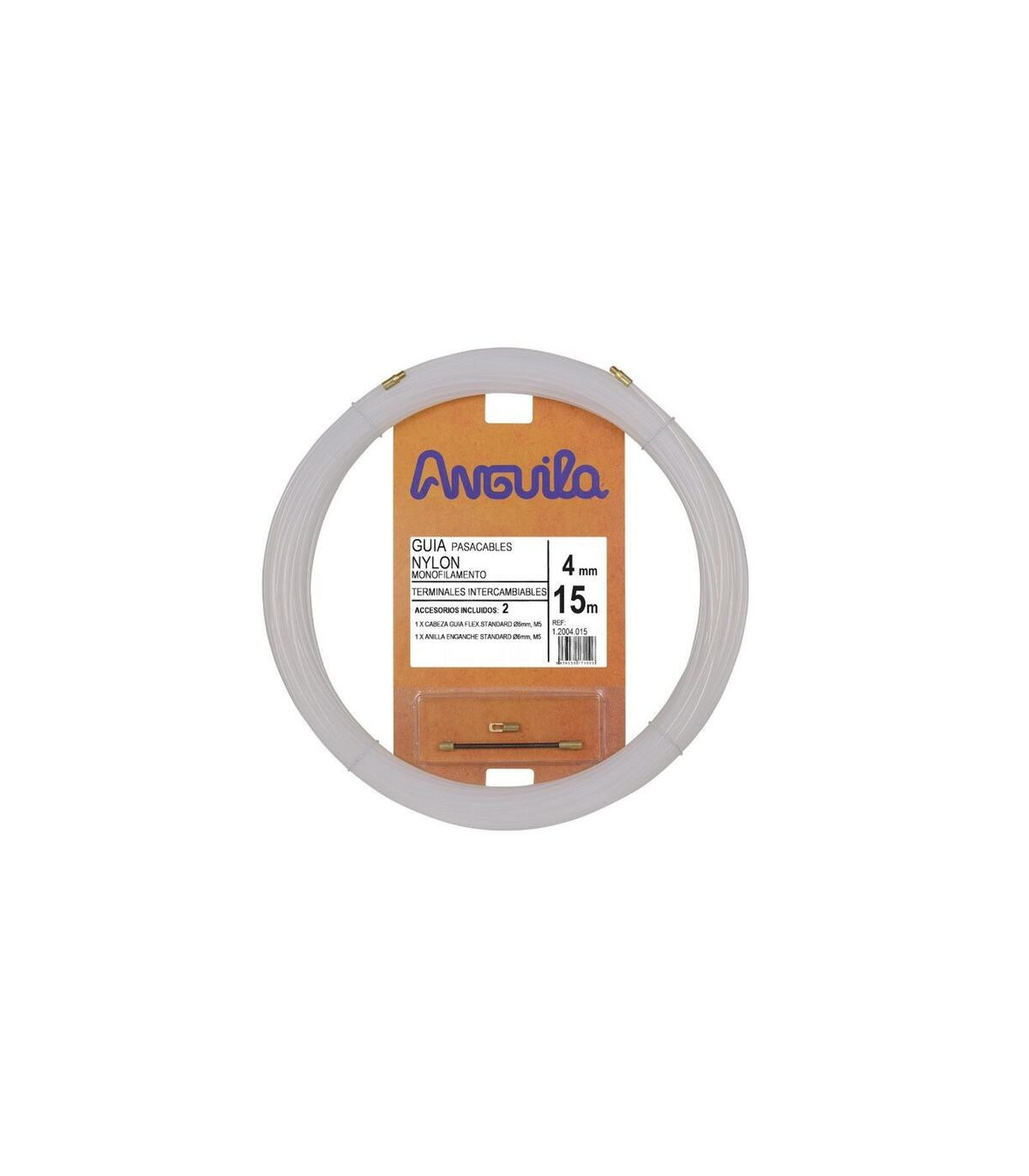 Guía pasa-cables de Nylon monofilamento de Ø 4 mm y 15 metros de longitud, color natural, provisto con terminales intercambiables, cabeza guía flexible de 6 mm Ø y anilla de tracción fija de 6 mm Ø. El Nylon es el material de mayor efecto memoria por lo que presenta más puntos de rozamiento, adquiriendo de forma original movimiento en espiral por lo que ejerce una menor fuerza de empuje, no siendo aconsejable su utilización en distancias superiores a los 20 o 25 metros. El pasacables 12004015 de Anguila es una herramienta flexible y resistente, fabricada en nylon de alta calidad, con un diámetro de 4 mm y longitud de 15 metros, ideal para facilitar el tendido de cables en instalaciones eléctricas.Su diseño intercambiable y duradero permite adaptarse a distintos diámetros de conductores y recorridos complicados, asegurando un deslizamiento suave y seguro del cableado. El color natural facilita la identificación del pasacables y contribuye a un uso versátil en entornos domésticos, indust