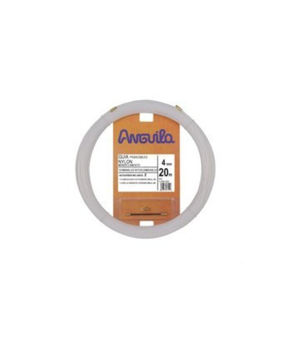 Guía pasa-cables de Nylon monofilamento de Ø 4 mm y 20 metros de longitud, color natural, provisto con terminales intercambiables, cabeza guía flexible de 6 mm Ø y anilla de tracción fija de 6 mm Ø. El Nylon es el material de mayor efecto memoria por lo que presenta más puntos de rozamiento, adquiriendo de forma original movimiento en espiral por lo que ejerce una menor fuerza de empuje, no siendo aconsejable su utilización en distancias superiores a los 20 o 25 metros. El pasacables intercambiable de nylon 12004020 de 4 mm y 20 m de la marca Anguila es una herramienta diseñada para facilitar la instalación y organización de cables eléctricos en distintos entornos, tanto domésticos como industriales. Fabricado en nylon de alta resistencia, este pasacables ofrece durabilidad y flexibilidad, permitiendo un paso seguro de los conductores sin riesgo de dañarlos ni de generar roces que comprometan su aislamiento. Su construcción ligera y resistente asegura un manejo cómodo durante el tendid