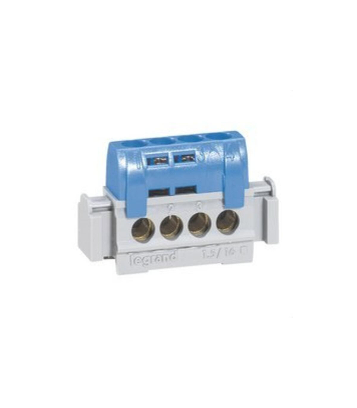 Bornas neutro 4 salidaS azul. Bornas de repartición con tornillo - Cumplen la norma IEC 60998-2-2 - Incluyen tornillos o tuercas enjauladas sin apretar - 100A máx. - 400 V~ con entrada de 25 mm² - 80A máx. - 400 V~ con entrada de 16 mm² Borneros aislados IP 2X - Se fijan en perfil simétrico o asimétrico, en soporte universal ref. 0 048 11 o sobre barra plana 12 x 2 - Neutro (azul) - Conexiones: 4 x 1,5 de 16 mm² - Longitud: 47mm. Borna de repartición - Repartición «estándar». La borna neutra 004840 de Legrand está diseñada para facilitar la conexión y distribución del conductor neutro en instalaciones eléctricas de manera segura y eficiente. Con cuatro salidas, permite conectar varios conductores a un mismo punto, simplificando el cableado y garantizando un flujo eléctrico estable. Su color azul distintivo facilita la identificación rápida del neutro, reduciendo errores en la instalación y aumentando la seguridad durante el montaje y mantenimiento.Fabricada con materiales de alta calid
