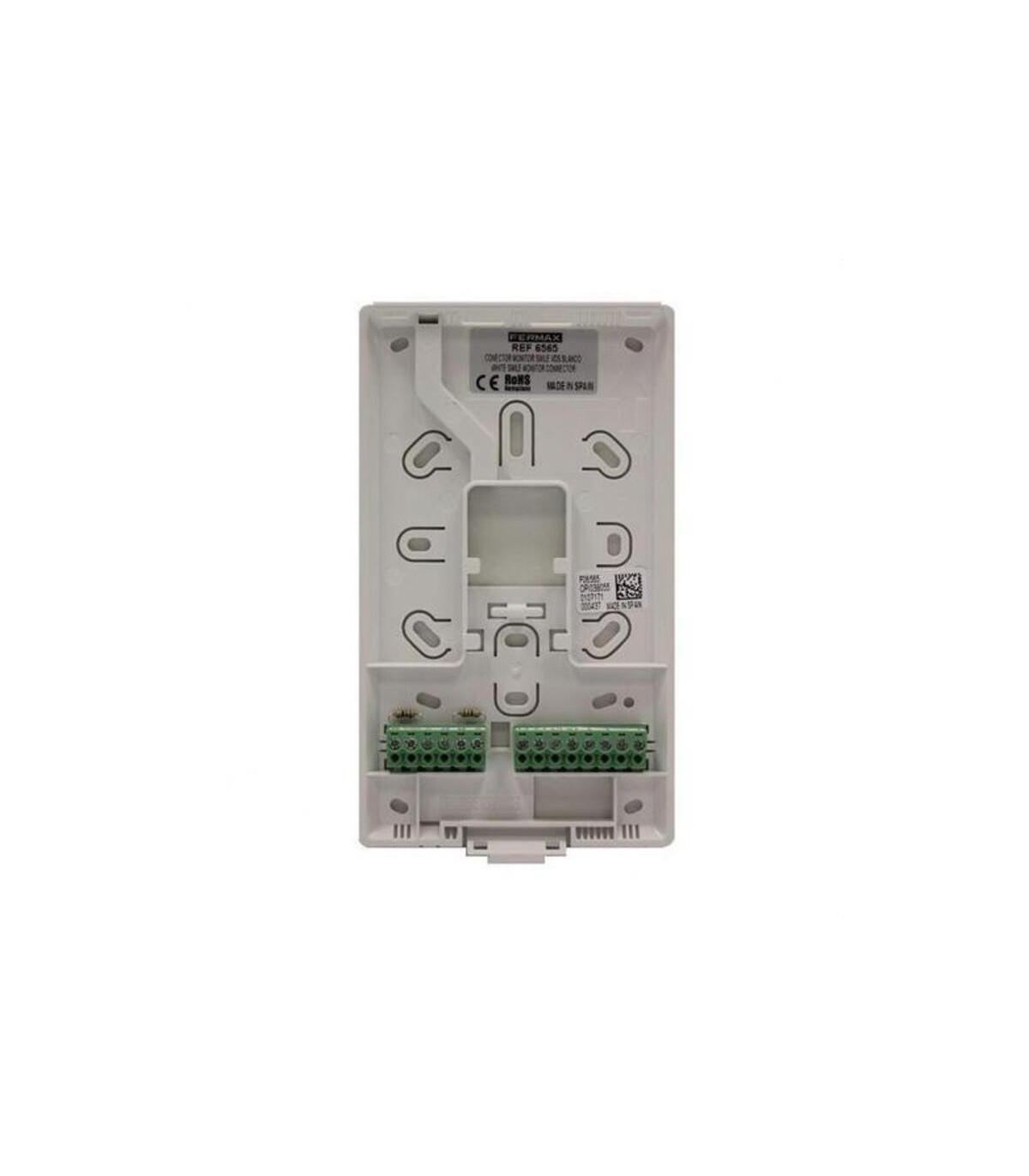 CONECTOR MONITOR SMILE VDS BLANCO. Conector de Instalación. Para Monitores Smile. Para sistema VDS. El conector Smile VDS blanco Fermax, referencia 6565, es un componente esencial para la instalación de monitores de la serie SMILE en sistemas de videoportero VDS. Diseñado específicamente para los modelos de 3.5" y 7", este conector permite el montaje del monitor sobre la superficie de la pared, facilitando una instalación limpia y segura. Fabricado en plástico ABS blanco, ofrece una alta durabilidad y una integración estética en cualquier entorno residencial o profesional.