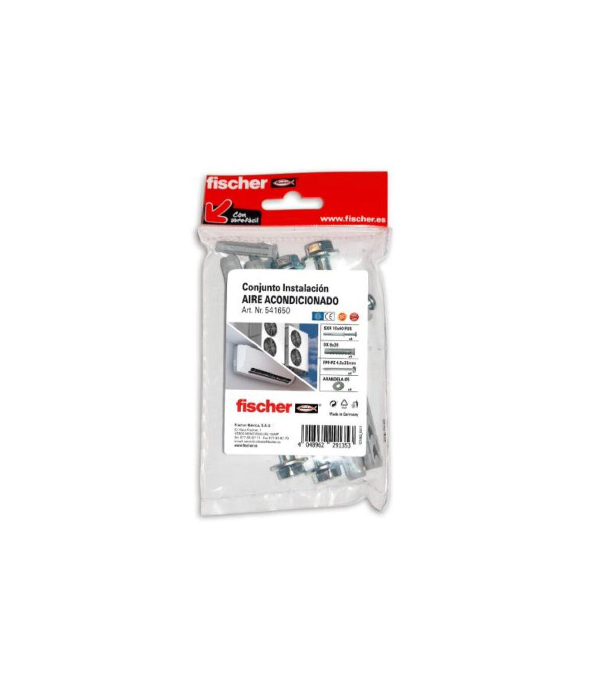 Conjunto instalación de aire acondicionado, kit para instalación a pared, kit formado por 16 piezas entre tornillos y tacos para su completo montaje El conjunto de instalación para aire acondicionado Fischer es un kit completo y práctico diseñado para facilitar la instalación de sistemas de aire acondicionado de manera rápida, segura y eficiente. Presentado en bolsa individual (1 unidad), incluye todos los componentes esenciales necesarios para una correcta fijación y montaje de los equipos, garantizando una instalación fiable y duradera.Fabricado con materiales de alta calidad, este conjunto ofrece resistencia frente al desgaste, la corrosión y las cargas mecánicas, asegurando que la instalación se mantenga segura a lo largo del tiempo. Su diseño pensado para el montaje sencillo y funcional permite a los profesionales del sector, así como a los aficionados con conocimientos técnicos, optimizar el tiempo de trabajo y minimizar errores durante la instalación.Además, este kit proporciona