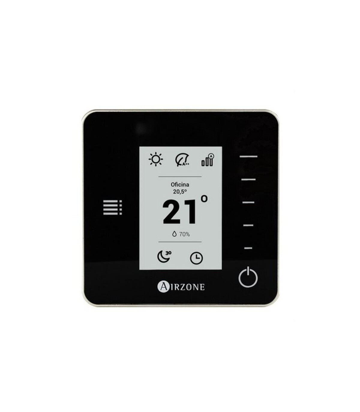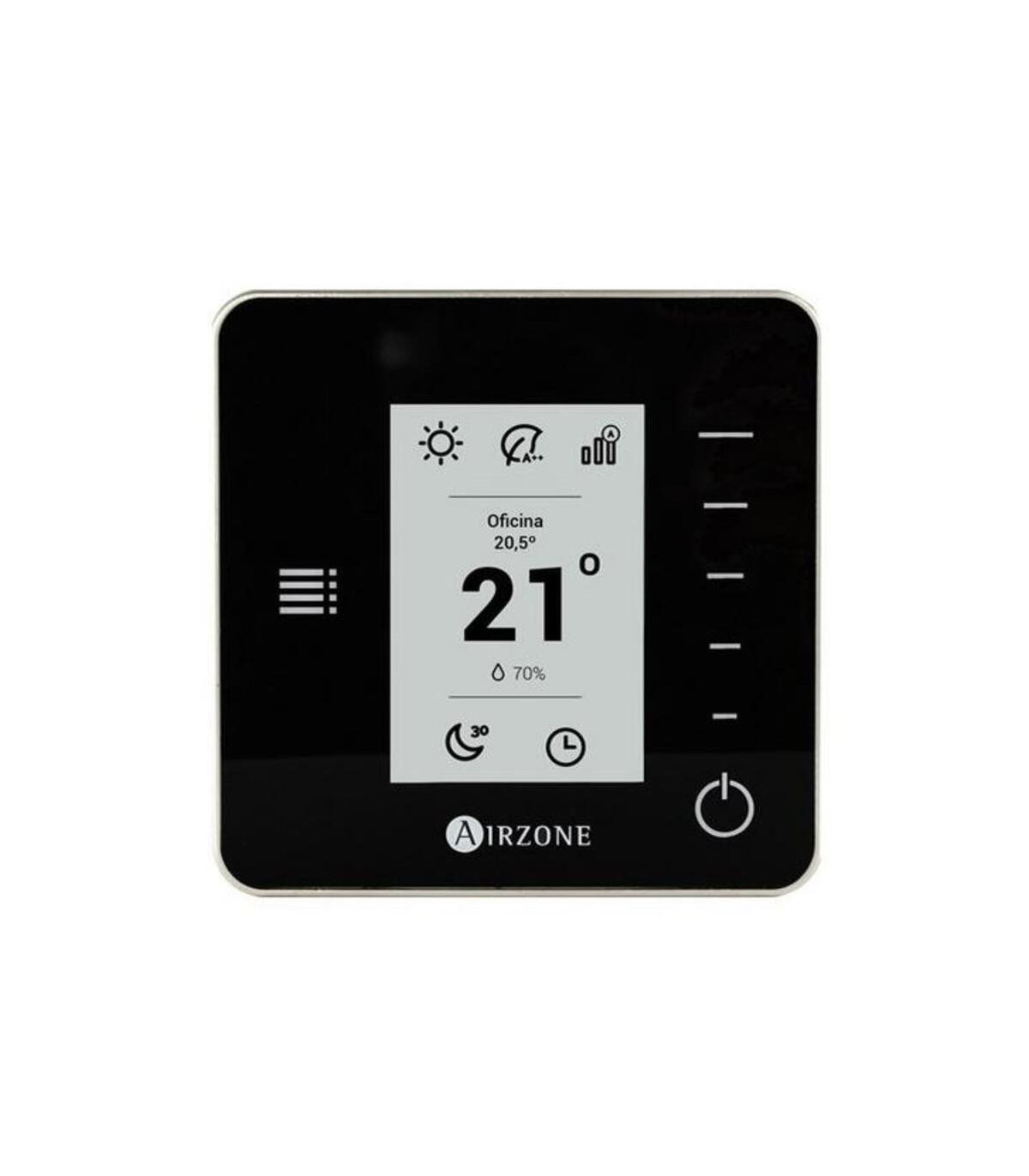 Termostato radio Airzone Think (CE6) de color negro, con pantalla de tinta de bajo consumo, botones capacitivos y acabado en acero y cristal, para el control de zona en un sistema Airzone. Se comunica vía radio, y se alimenta mediante batería de botón CR2450. Disponible en blanco y negro. Sus funcionalidades son 6 idiomas disponibles (español, inglés, francés, italiano, alemán y portugués), control de temperatura, modo de funcionamiento (termostato maestro) y velocidad del sistema (termostato maestro e instalación Fan coil).. El termostato monofásico Airzone Think AZCE6THINKRN, con acabado en cromo y negro, está diseñado para controlar de manera precisa la climatización de hasta 8 zonas en entornos residenciales o comerciales. Fabricado con materiales de alta calidad, ofrece durabilidad, fiabilidad y un funcionamiento estable, permitiendo gestionar la temperatura de forma eficiente y personalizada en cada zona. Su diseño moderno y elegante se integra fácilmente en cualquier estilo de d