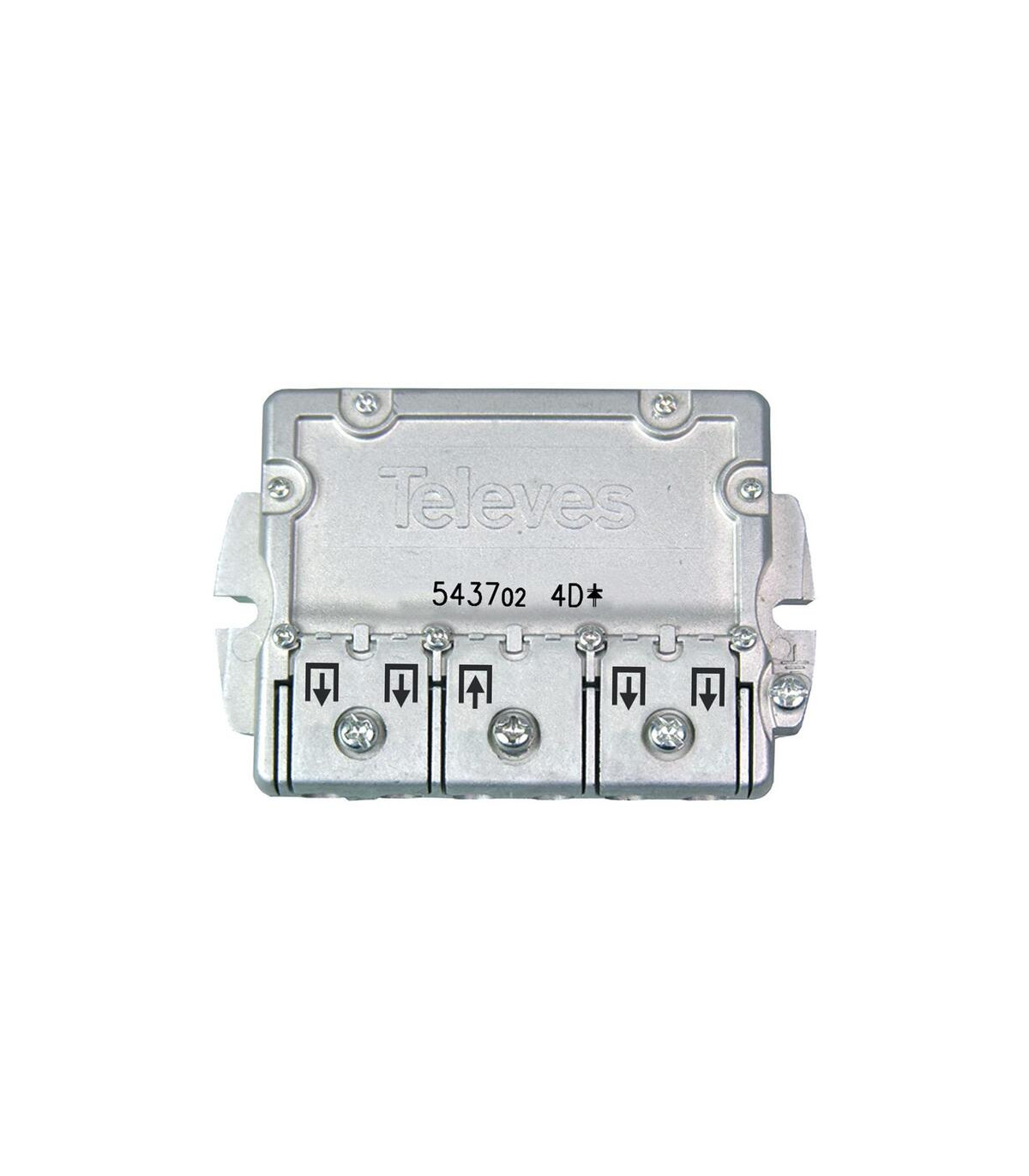 Repartidor EasyF 4D 5...2400MHz 9/7,5dB. Repartidor de 4 direcciones y sistema de conexión EasyF, para señales de SMATV, con un diseño compacto y un comportamiento electrónico eficiente. Es de instalación interior, pero también es apto para exterior siempre dentro de un cofre (ref. 4177). Embalaje: Caja, Complementos: Repartidor.. Sistema de conexión EasyF: facilidad de instalación y ahorro en el montaje. Fabricado en Zamak, gran blindaje. Gran fiabilidad: fabricación automatizada con microcomponentes de última generación. El repartidor 4 direcciones 543702 de Televés es un dispositivo pensado para la distribución de señales de televisión e ICT en instalaciones residenciales o comerciales. Permite derivar la señal hacia cuatro salidas independientes, asegurando una transmisión estable y de alta calidad.Fabricado con materiales duraderos y resistentes a interferencias, este repartidor garantiza una correcta atenuación de la señal y mínima pérdida en cada salida. Su diseño compacto facil