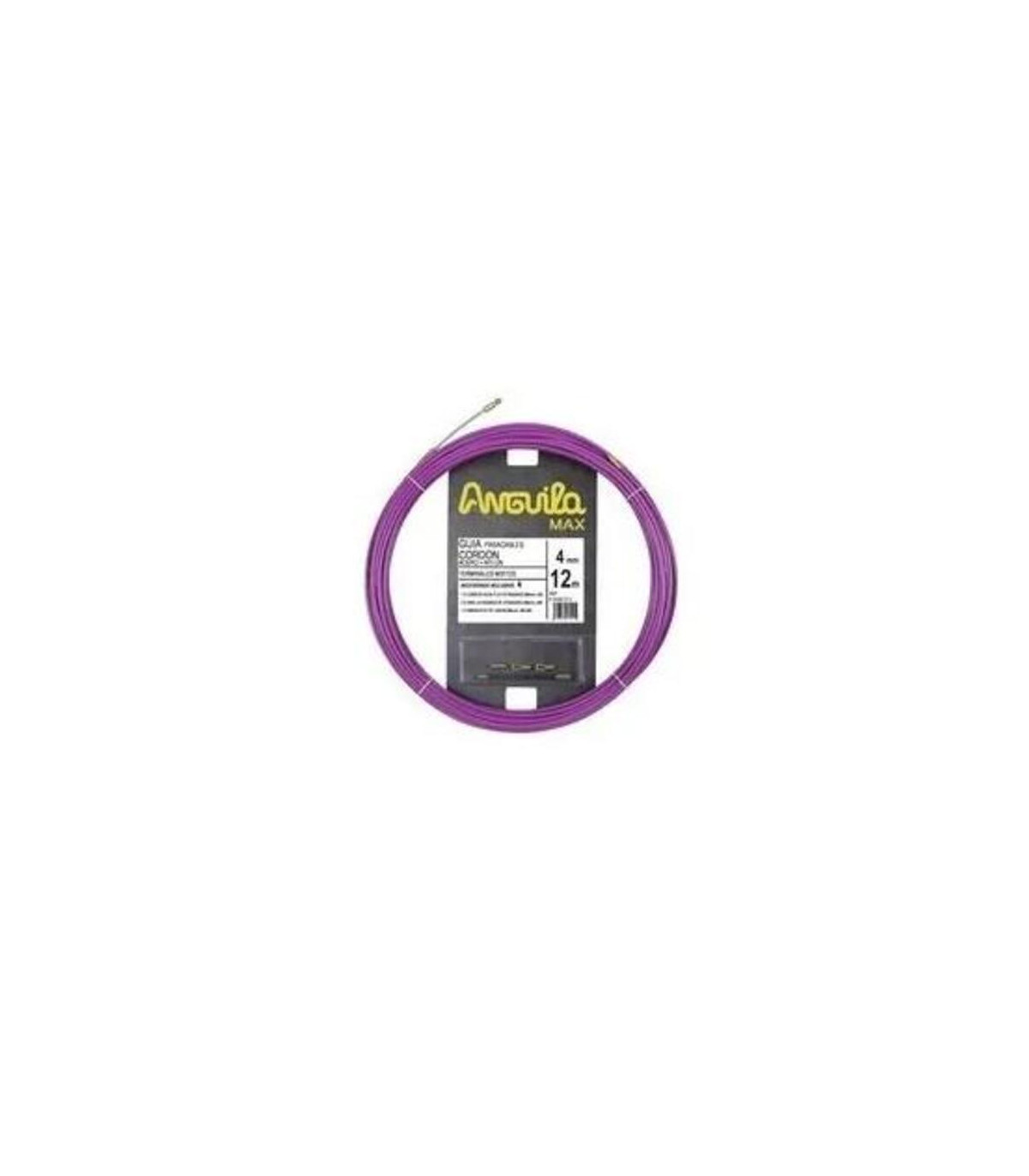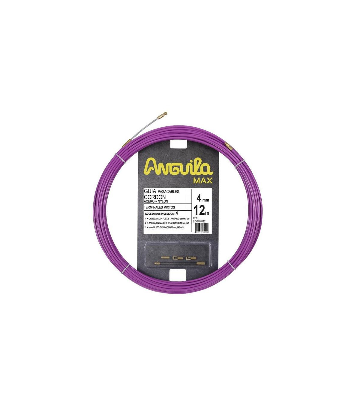 Guía pasa-cables de Cordón de Acero de Ø 4 mm y 12 metros de longitud, protegida con funda de Nylon de gran resistencia, color fucsia, provista con terminales mixtos y accesorios incluidos: cabeza guía flexible de 6 mm Ø, 2 anillas de tracción fija de 6 mm Ø y un manguito de unión M5 El Cordón de acero es un material con poco efecto memoria y muy apropiado para trabajos severos, ofreciendo un excelente comportamiento frente al rozamiento, es muy compacto lo que ofrece muy buenas prestaciones de torsión en cualquier dirección y como su peso es mayor le permite alcanzar distancias más largas. El pasacables 65040012 de Anguila Max está diseñado para facilitar la instalación de cables eléctricos en conducciones de manera rápida y segura. Con un diámetro de 4 mm y una longitud de 12 metros, este pasacables permite guiar los cables a través de tuberías y conductos sin esfuerzo, evitando enganches o daños en los conductores. Su combinación de acero y nylon asegura resistencia y flexibilidad,