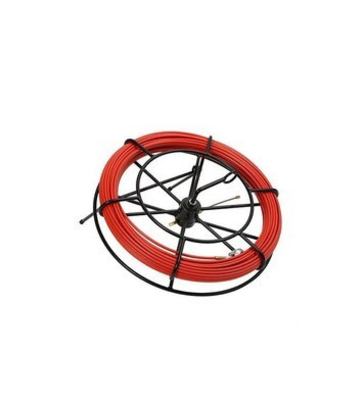 Guía pasa-cables de Fleje de Acero de Ø 6 mm y 50 metros de longitud, protegida con funda de polipropileno de gran resistencia, color rojo, provista con terminales intercambiables y accesorios incluidos: cabeza guía flexible de 8 mm Ø, rollana de aluminio Ø 30 mm y anilla de enganche de latón de Ø 8 mm, suministrado en contenedor metálico H450 provisto de anilla guía, freno de seguridad y soporte accesorios. El Fleje de acero es un material con poco efecto memoria y muy apropiado para trabajos severos, ofreciendo un excelente comportamiento frente al rozamiento. Su estructura plana mejora las prestaciones de rotación, presentando un gran equilibrio entre flexibilidad y rigidez ofreciendo de este modo unas buenas prestaciones de fuerza de empuje. El pasacables 20602050 está diseñado para ofrecer una solución resistente y confiable en instalaciones eléctricas y de telecomunicaciones. Fabricado con acero y nylon de alta calidad, combina rigidez y flexibilidad, lo que permite que los cable