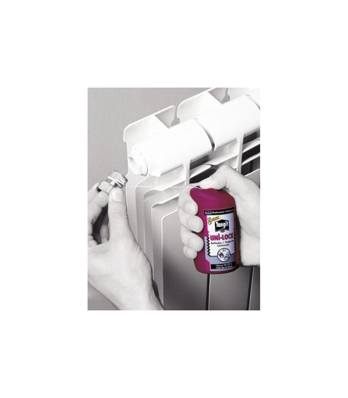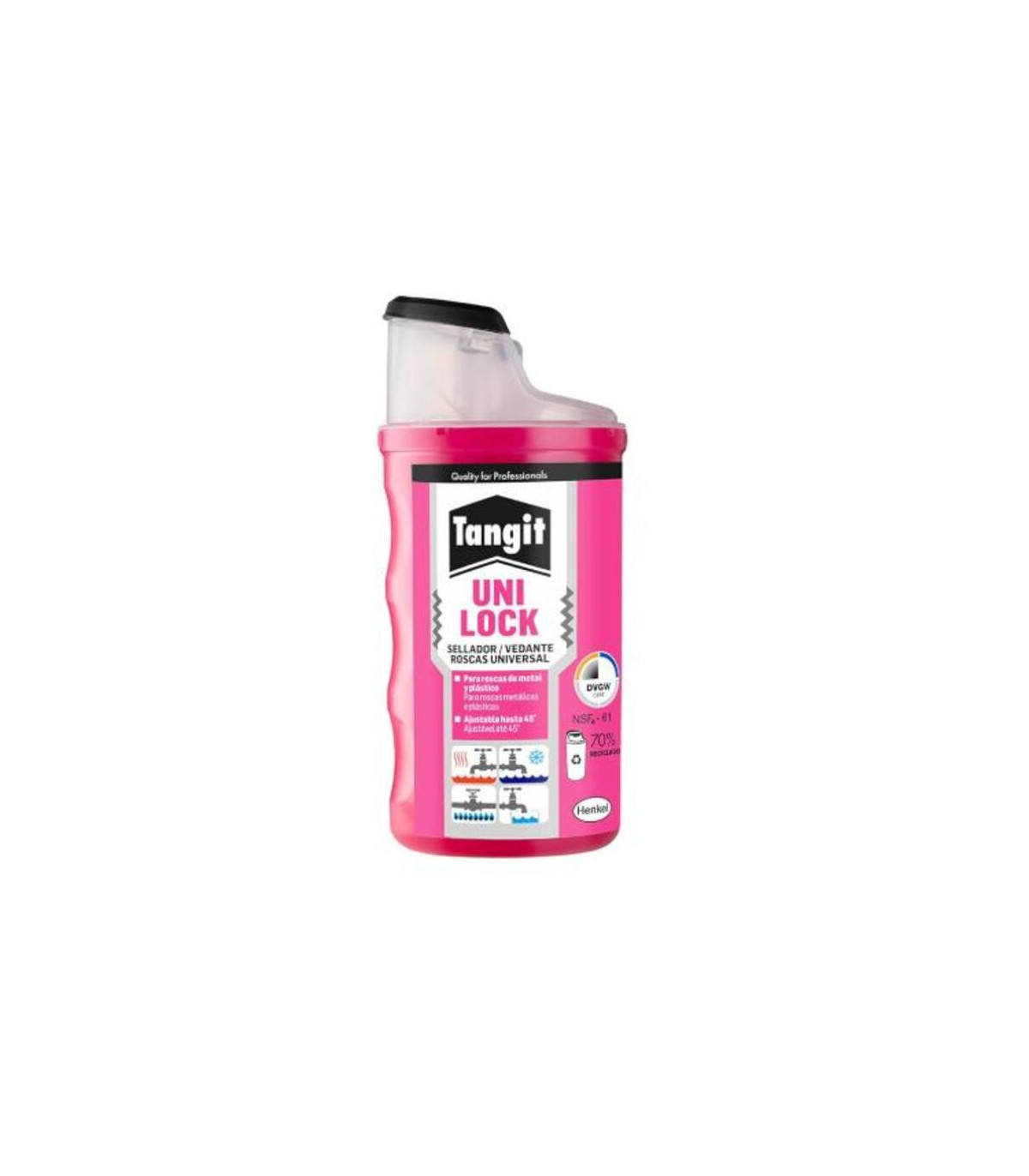 El adhesivo uni-lock Tangit en envase de 160ml, es un sellador universal para todo tipo de roscas, y es apropiado para conseguir estanqueidad de uniones de tuberías roscadas plásticas y/o metálicas. Sustituye de forma práctica las cintas de teflón o cáñamo, asegurando la estanqueidad entre las roscas. El Adhesivo PVC Uni-Lock Tangit en envase de 160 ml (referencia 2959378) de la marca Henkel es un pegamento especializado para la unión de tubos y accesorios de PVC rígido. Su fórmula de alta resistencia permite una soldadura química segura y duradera, ideal para instalaciones de agua a presión, desagües y sistemas de conducción.