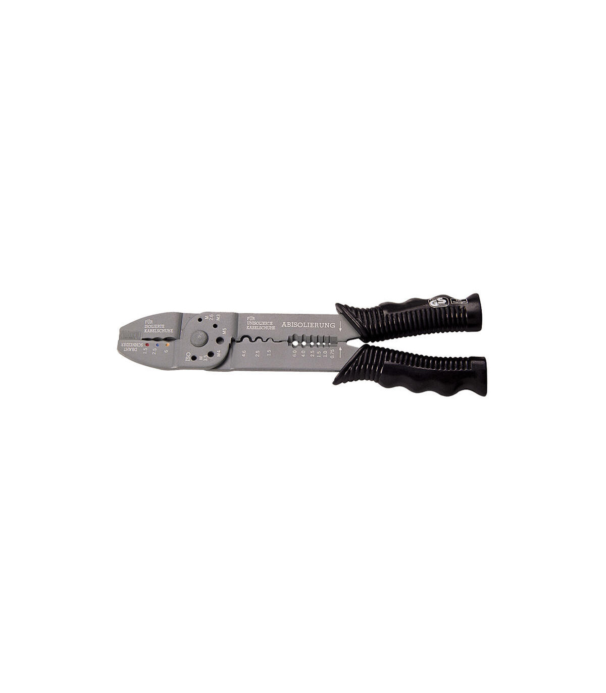 Terminales aislados (1,5-2,5-6), terminales no aislados (1,5-2,5-4,6), corte tornillos (M 2,6-3-3,5-4-5), pelacables (0,75-1,0-1,5-2,5-4,0-6,0) y corta cables. Mango ergonómico.