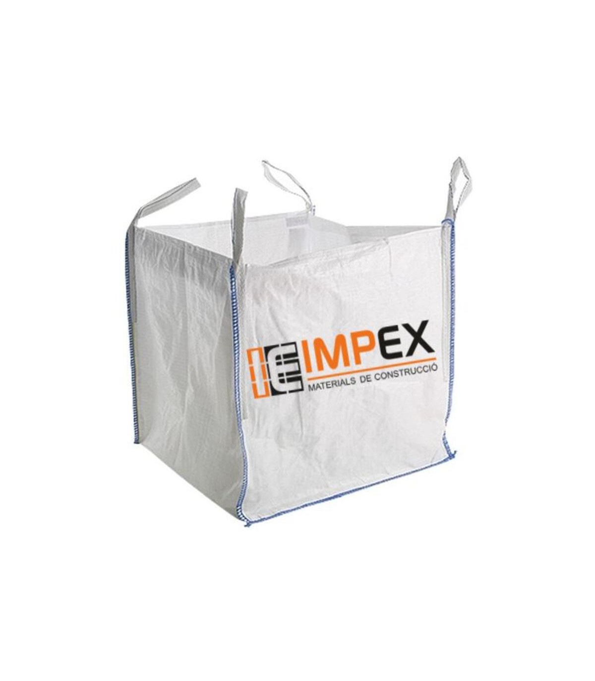 Bolsa de gran capacidad tipo Big Bag fabricada por IMPEX, con dimensiones de 90 cm de ancho, 90 cm de profundidad y 100 cm de altura. Ideal para transporte y almacenamiento de materiales a granel como áridos, escombros, materiales de construcción, residuos o productos industriales. Resistente y duradera, diseñada para soportar cargas pesadas y facilitar la manipulación con maquinaria. Perfecta para uso en obra, almacenes o industria.