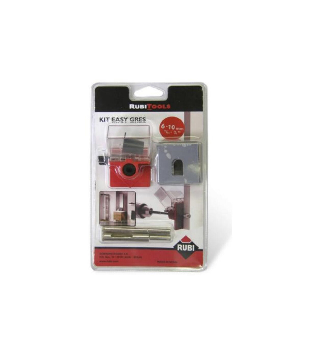 Kit de brocas EASYGRES de 8 mm, que son la solución más económica para aquellos usuarios que necesitan realizar perforaciones, de distintos diámetros, en todo tipo de baldosa cerámica. Las EASYGRES son brocas de diamante electro depositado, de corte húmedo, aptas para utilizar con taladro eléctrico sin percutor. La calidad del diamante utilizado en el diseño y fabricación de las brocas permite la perforación de gres, gres porcelánico, granito, mármol y vidrio. RUBI pone a disposición del profesional de la construcción diferentes kits de producto, con configuraciones adaptadas a las situaciones más comunes. Antes de realizar una nueva perforación debemos asegurarnos que la broca está limpia y libre de cualquier obstrucción. La velocidad de uso recomendada para las brocas EASYGRES es de entre 400 y 1000 r.p.m, en función del material a perforar. El Kit Easy Gres con broca de 8 mm de Rubi está diseñado para facilitar la perforación de gres y cerámica con precisión y eficacia. Este kit inc