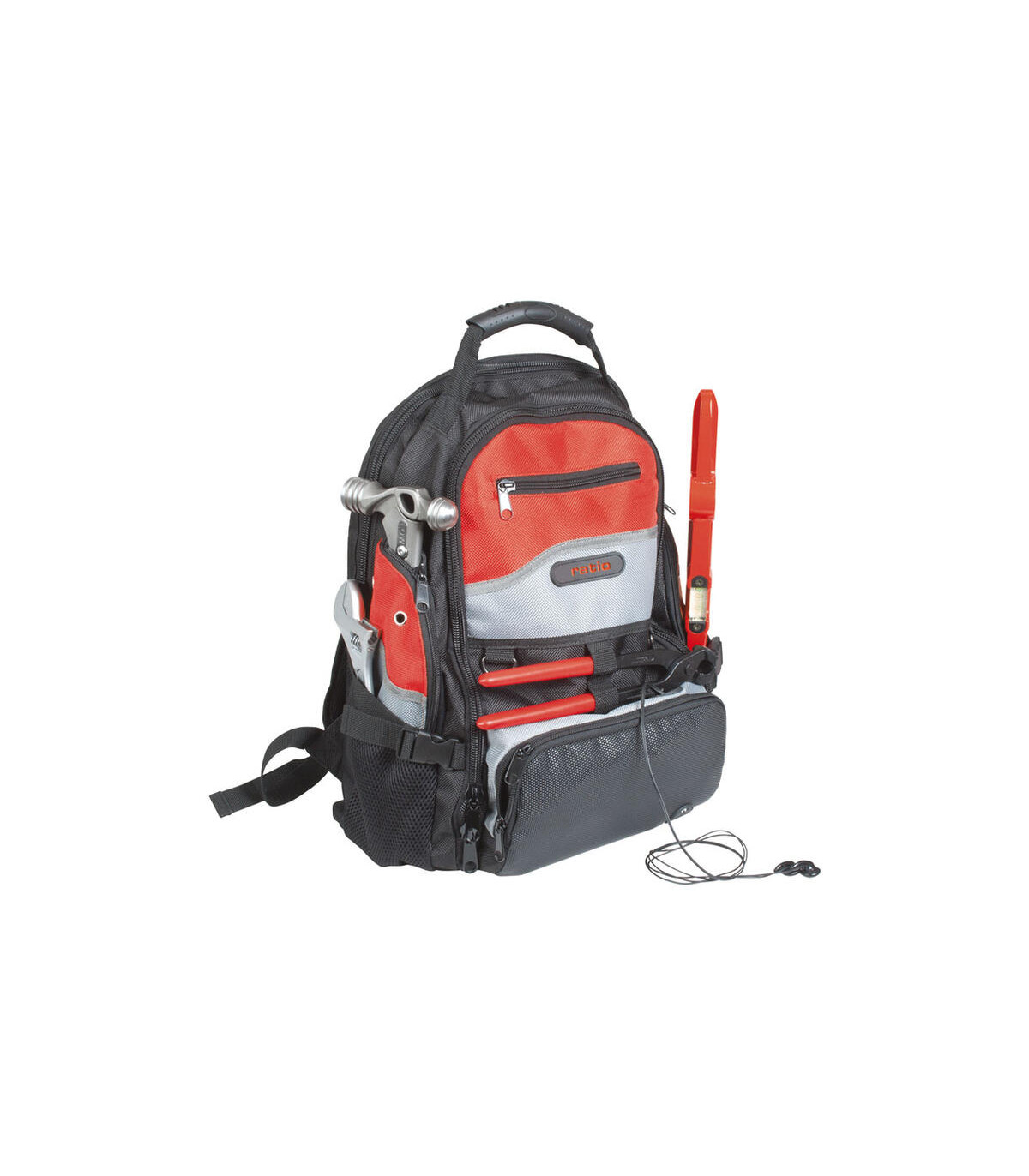 Producto sin stock temporalmente. Nos pondremos en contacto para confirmar fecha de entrega Poliéster impermeable 900 deniers. 18 bolsillos. 2 compartimientos principales con cierre y cremallera: uno para herramientas y otro protegido para ordenador o tablet. Cierres laterales de seguridad. Correas acolchadas. Bolsillo exterior multimedia con 2 orificios para cable de auriculares.