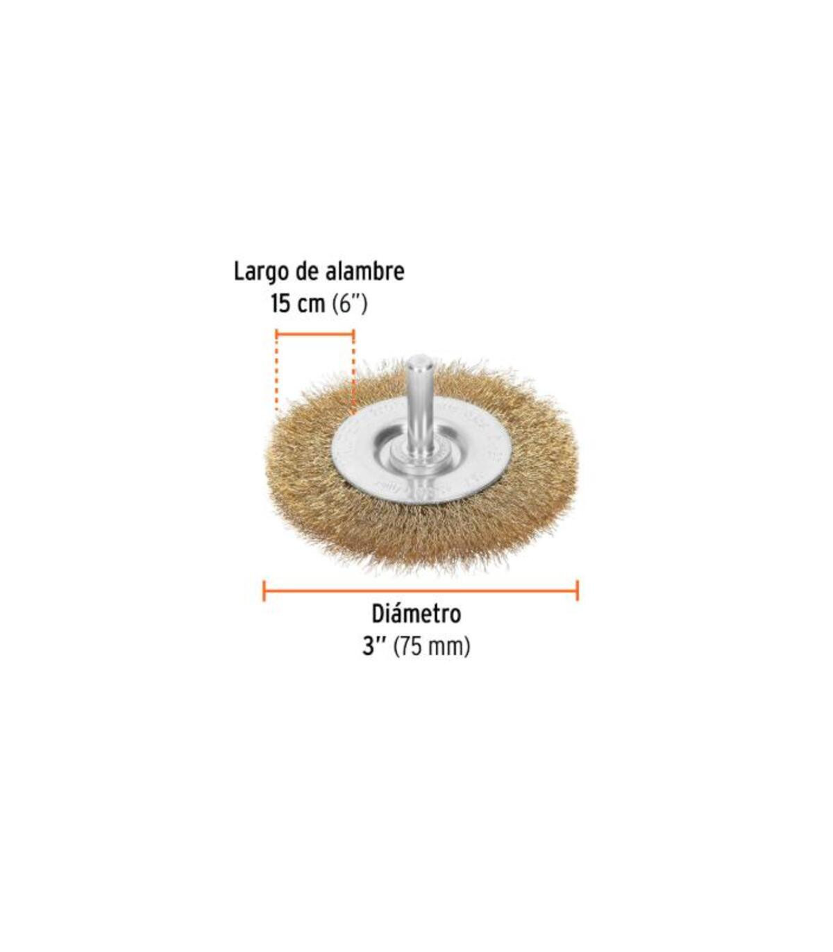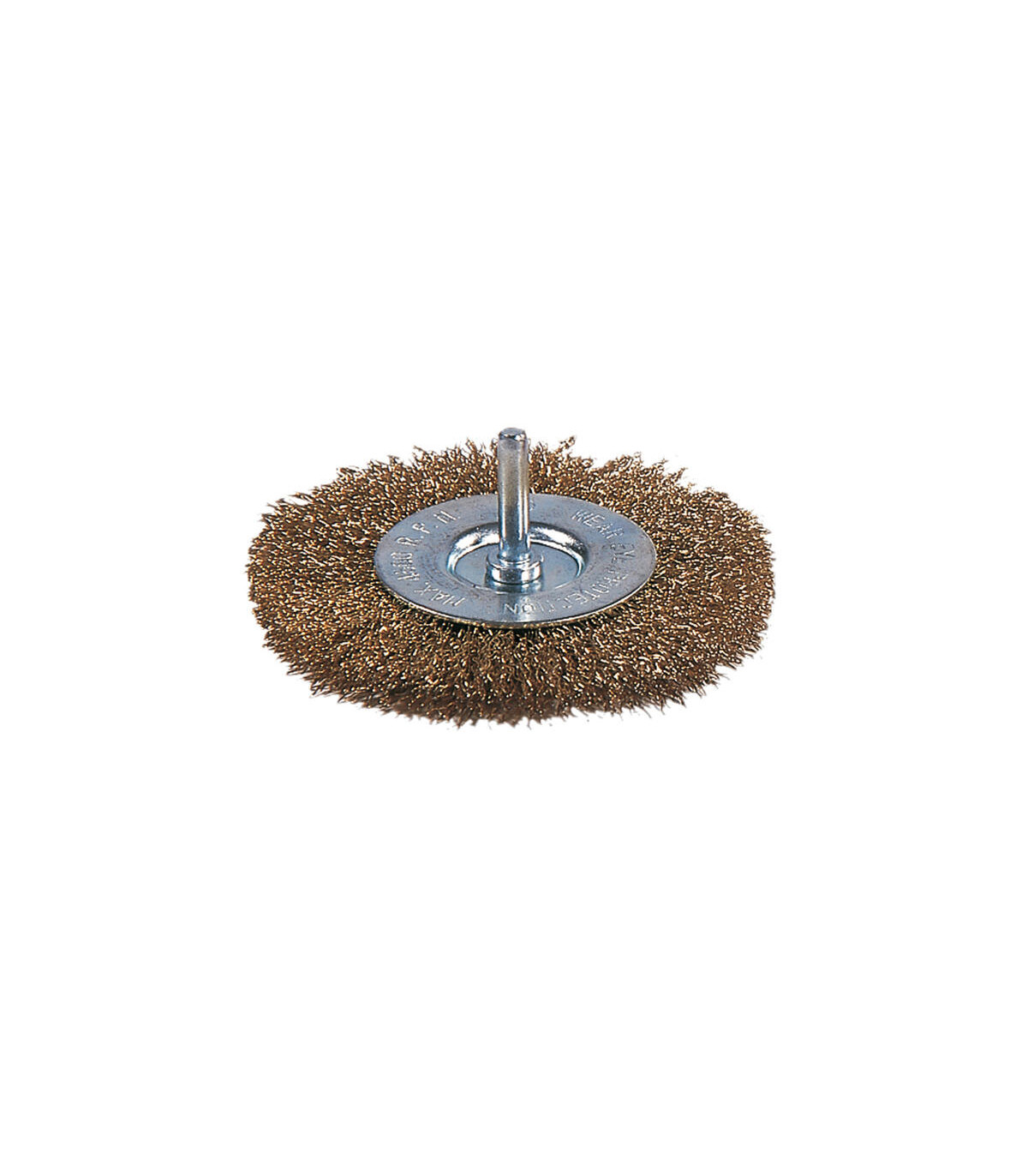 Cepillo abrasivo circular para taladro RATIO. Acero latonado ondulado. Vástago 6 mm. Púas 0,30 mm. ø 75 mm.