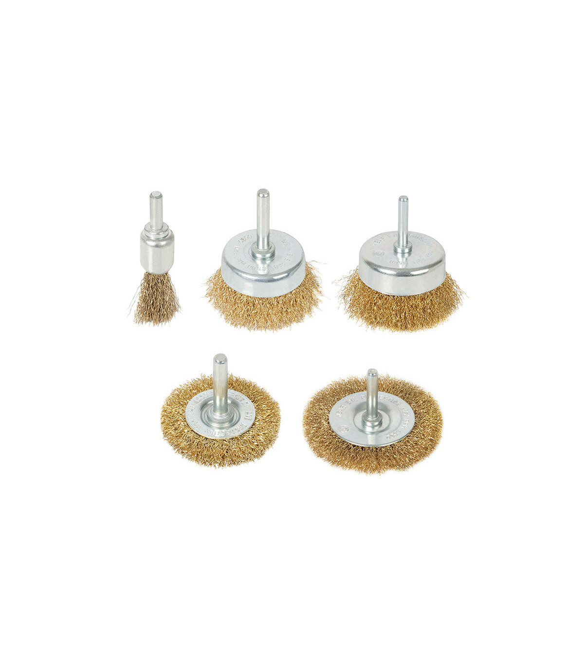 Kit 5 cepillos abrasivos para taladro RATIO Hilo acero latonado ondulado. Para eliminar pintura, óxido y pulir metales. Vástago ø 6 mm. Cepillo pincel ø 16 mm. Cepillo copa ø 50, 70 mm. Cepillo circular ø 50, 75 mm.