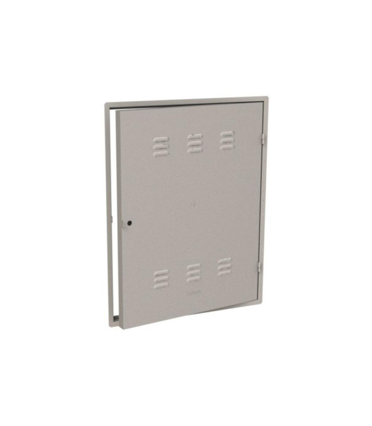 Puerta para nicho 966x750x300 cierre triangular. Características: puerta fabricada en chapa de acero galvanizado de 1 hoja. Acabado con pintura de poliéster y gofrado, color gris RAL-7035 mate. Rejillas de ventilación en la puerta. Grado de protección contra impactos IK10 según UNE-EN 50 102. Cerradura metálica accionada por cabeza triangular y herraje candado, según especificaciones de la Compañía. Triángulo de peligro estampado en la puerta. Bisagras amovibles para extraer la puerta, inaccesibles desde el exterior. Aplicación para montaje de CDU