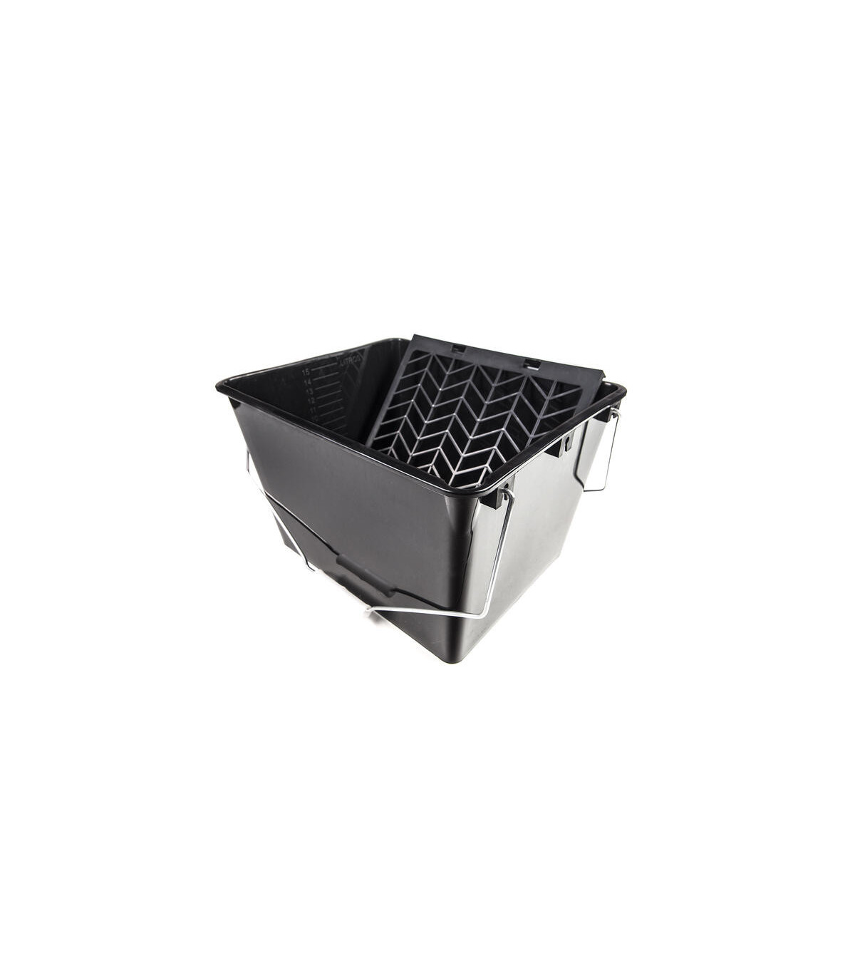 Herramienta imprescindible en cualquier trabajo de pintura, esta cubeta de 16 litros en color negro, lleva incorporado una esquina para verter líquidos, fondo inclinado y un medidor de litros.