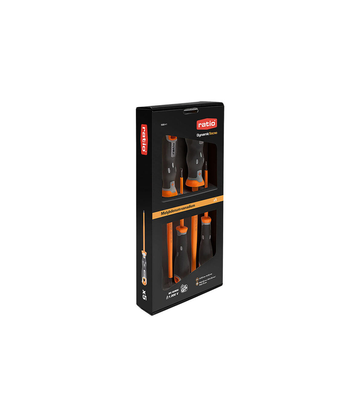 Juego 5 destornilladores aislados RATIO DynamicTecno Mango trimaterial antideslizante. Varillas acero molibdeno-vanadio 60 HRc
