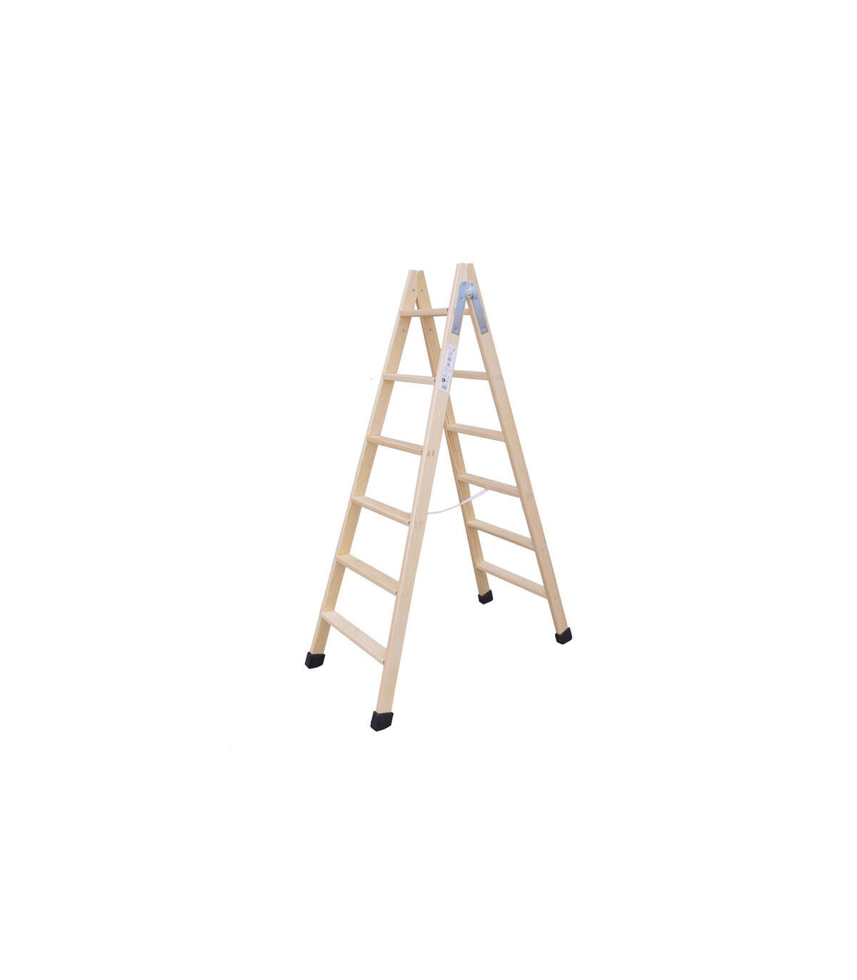 Producto sin stock temporalmente. Nos pondremos en contacto para confirmar fecha de entrega Escalera de pintor. Madera doble. Peldaños planos de 6 cm. de profundidad. Tacos antideslizantes. 7 peldaños.