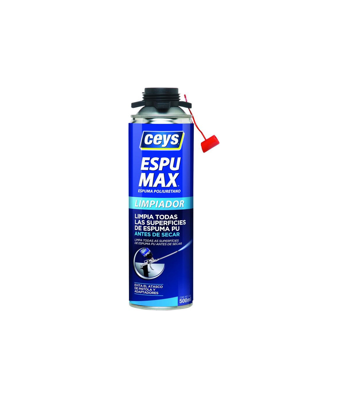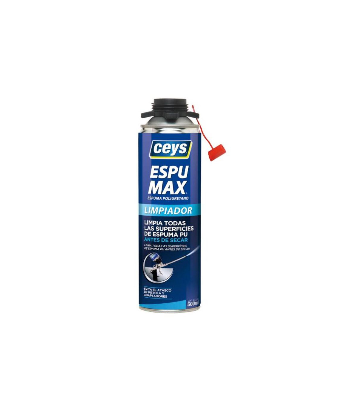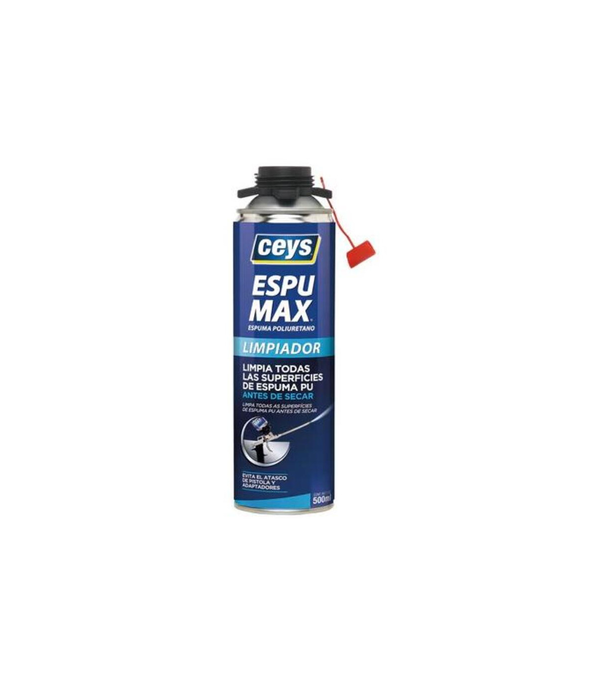 Espuma de poliuretano ESPUMAX LIMPIADOR 500ml (aerosol), para eliminación y limpieza de toda clase de residuos de espuma de poliuretano no seca, tanto en pistolas aplicadoras como en otros objetos y superficies. Una correcta limpieza de la pistola aplicadora garantiza un correcto funcionamiento y previene de posibles averías. Este limpiador está también recomendado para la limpieza de las válvulas y las cánulas. Utilizar después de cada aplicación de espuma de poliuretano antes de que ésta se seque. Limpieza de sobrante Limpieza de pistola La espuma de poliuretano Espumax Limpiador en aerosol de 500 ml de Ceys (referencia 504804) es un producto especializado para la limpieza y mantenimiento de pistolas aplicadoras de espuma de poliuretano. Su fórmula permite eliminar restos de espuma fresca y evitar obstrucciones en la herramienta, prolongando su vida útil y asegurando un rendimiento óptimo en cada aplicación.Ideal para profesionales y usuarios que trabajan con espumas expansivas, este