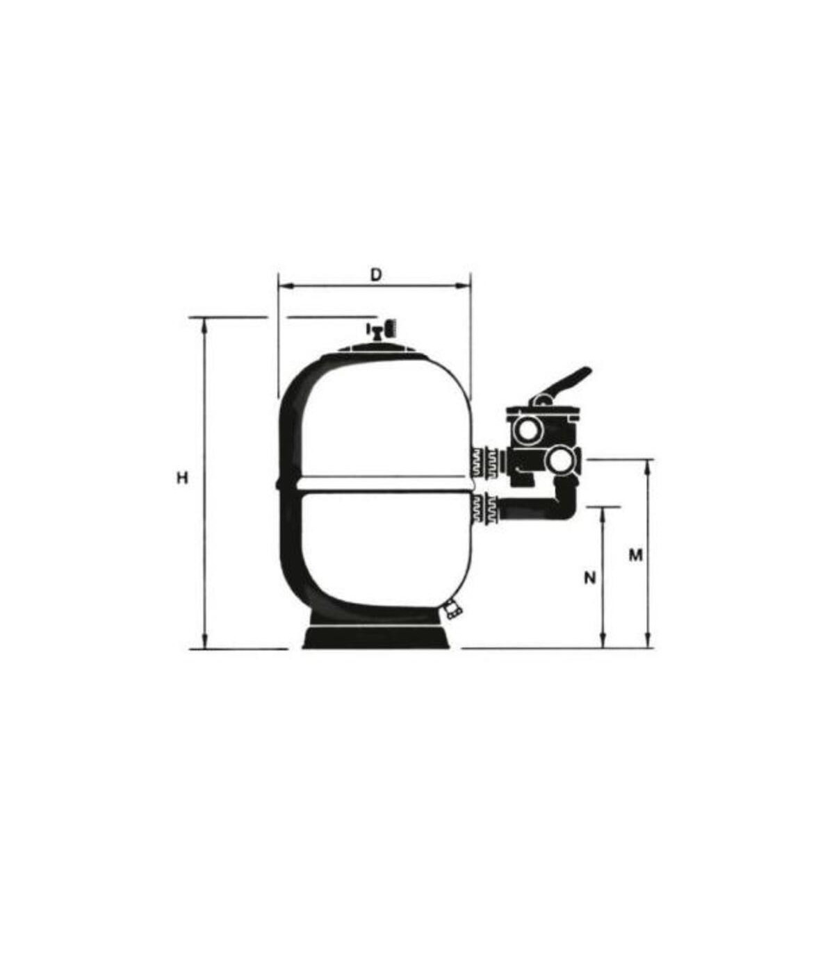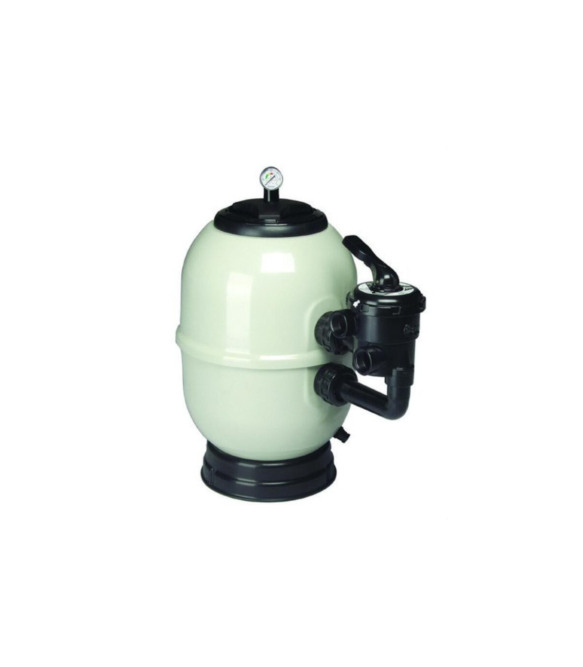 Filtro laminado en poliéster y fibra de vidrio diámetro 600mm. Pie en polipropileno y tapa sin tornillos. Color gris. Equipado con manómetro, tapón para vaciado del agua y válvula selectora lateral. Presión máxima de trabajo: 2,5kg/cm2. Velocidad máxima de filtración 50m3/h/m2.