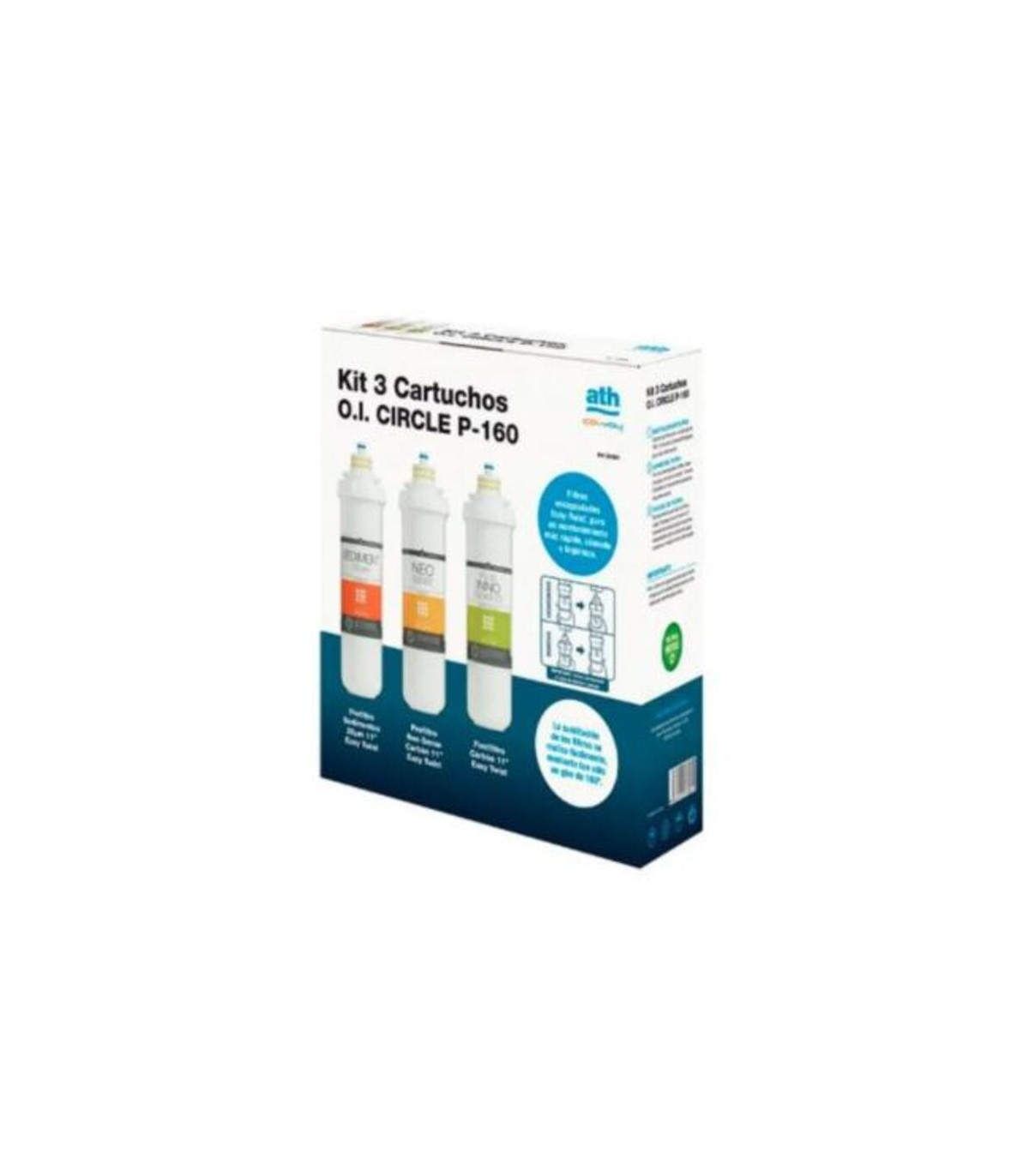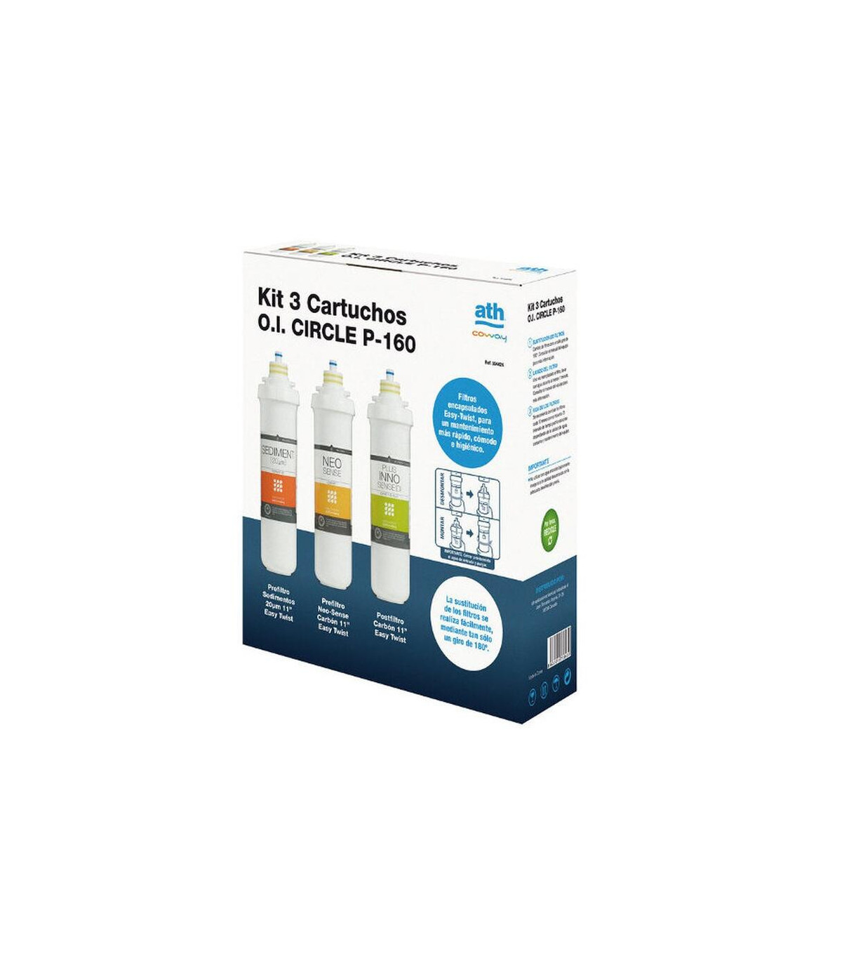 Producto sin stock temporalmente. Nos pondremos en contacto para confirmar fecha de entrega Kit de recambios originales ATH para ósmosis doméstica modelo Circle de Ath compuesto por 3 filtros encapsulador "Easy twist" de Coway y distribuido por ATH.