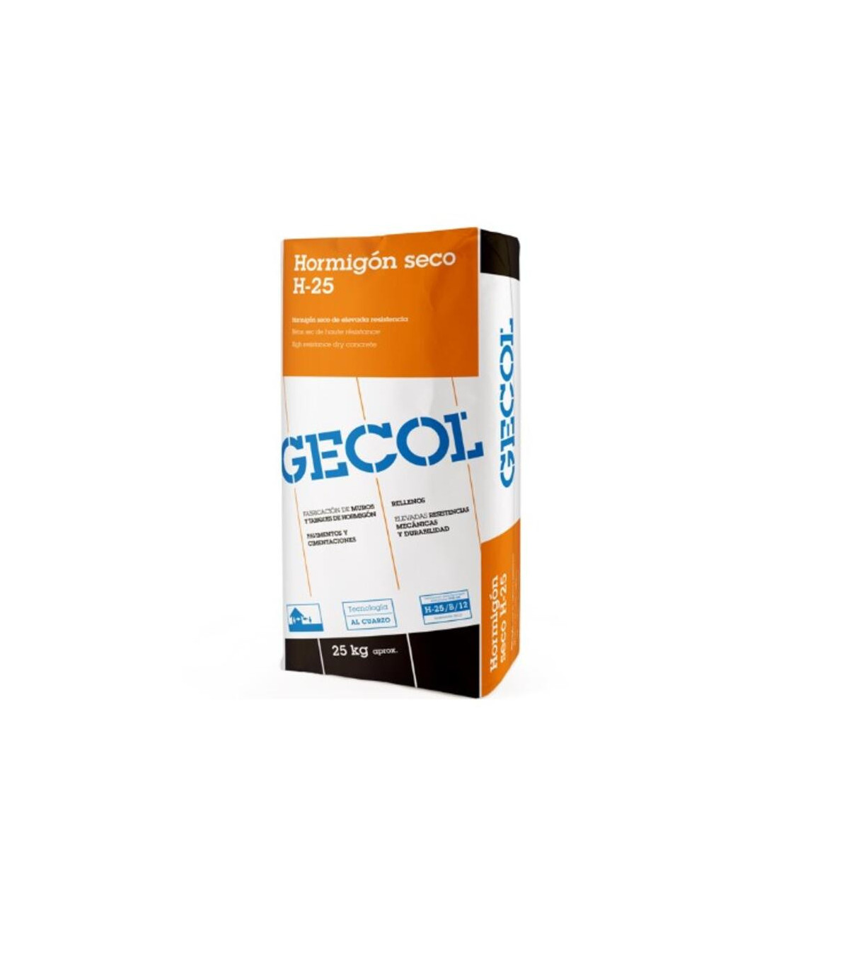 El hormigón seco GECOL H-25 es una mezcla preparada de alta calidad, diseñada para ofrecer una resistencia característica de 25 MPa, ideal para trabajos de obra general. Su formulación garantiza una excelente trabajabilidad y un fraguado uniforme, facilitando la ejecución de cimentaciones, soleras, reparaciones y elementos estructurales ligeros. Solo requiere añadir agua para obtener una masa homogénea y consistente. Se presenta en sacos de 25 kg, disponibles en **packs de 48 unidades**, perfectos para obras de mayor envergadura o consumo continuado.