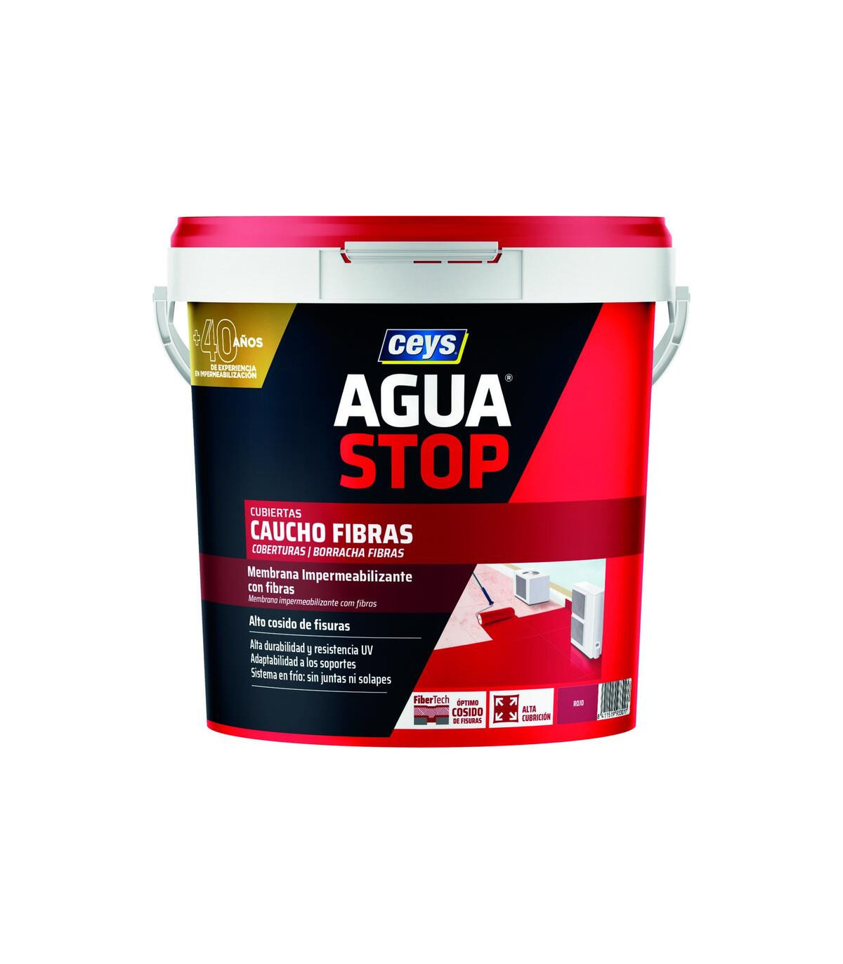Revestimiento impermeable anti goteras AGUA STOP CAUCHO FIBRAS rojo 5Kg (bote), en base de caucho reforzado con fibras. Producto mono componente bicapa con un alto contenido en sólidos, presenta una gran capacidad de relleno y un óptimo cosido de fisuras sin una merma significante en el curado de la membrana. A su vez, su fórmula exclusiva reforzada con fibras, nos permite la reparación sin necesidad de aplicar mallas geotextiles, velos, etc. sin perder elasticidad ni resistencia mecánica. Disponible en Rojo, Terracota, Gris, Blanco, Negro y Verde. Trabajos de impermeabilización y reparación de filtraciones en: Cubiertas visitables o de mantenimiento. Cubiertas planas con pendiente mín. del 3% y cubiertas inclinadas. Encuentros entre cubierta y elementos verticales (chimeneas, shunts, cuartos de ascensor, bancadas, faldones, salidas de ventilación)Cubiertas de teja, de fibrocemento o madera no degradadas, azoteas, terrados y terrazas visitables con pendiente (mínimo 3%).