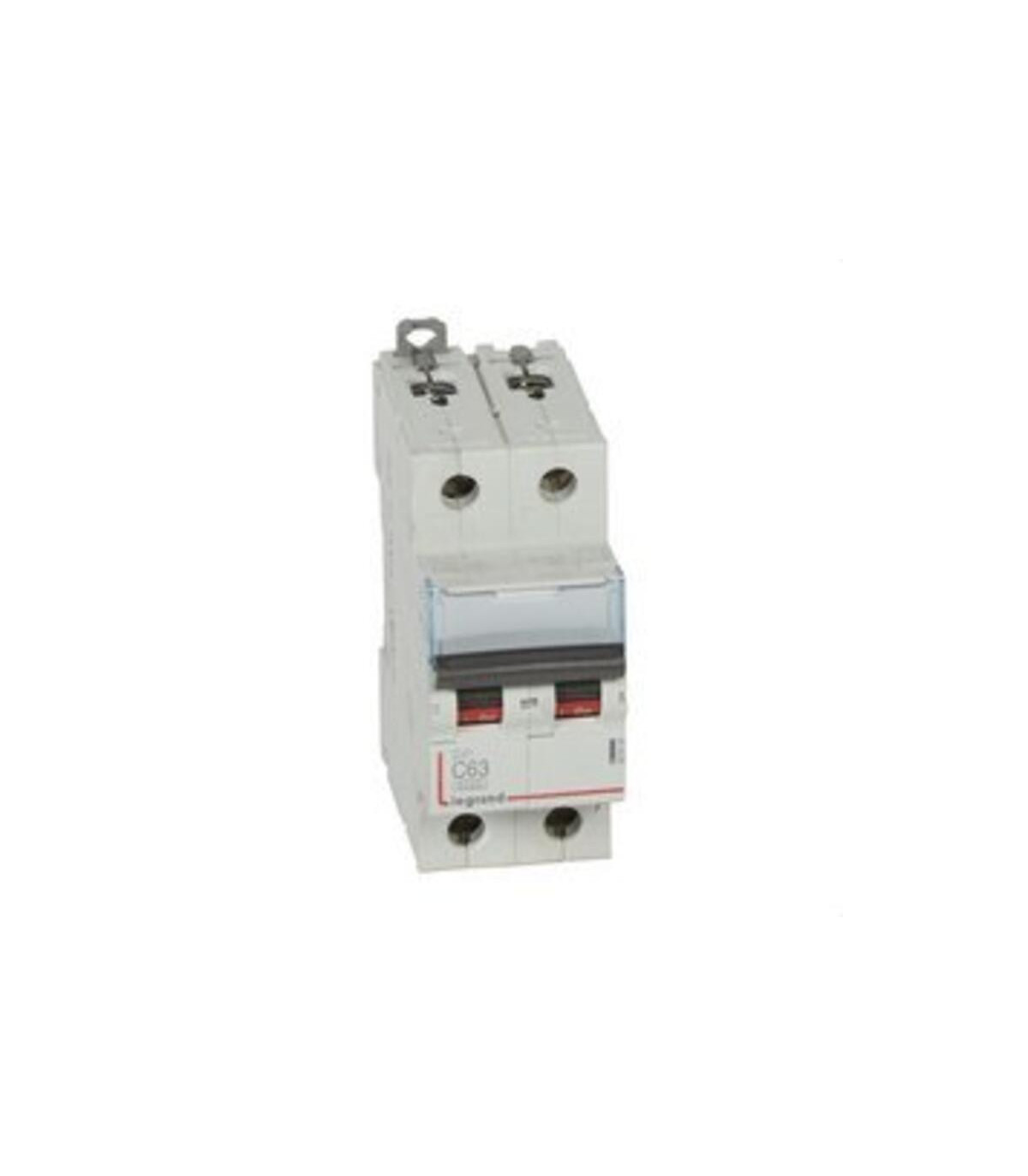Magnetotérmico DX3 6/10KA-C 2 polos 63A. Bipolar 230/400 V~ - Curva C - Intensidad nominal: 63A - Número de módulos: 2. MCB DX³ 6000 - 10 kA - interruptores automáticos magnetotérmicos de 1A a 63A - curvas C, B y D - Admiten la conexión con peines unipolares y peines multipolares Poder de corte: - 6000 - IEC 60898-1 - 400 V~ - 10 kA - IEC 60947-2 - 400 V~ - Productos con marca N (excepto 1P+N 2 módulos y curva B) - Se pueden equipar con bloques diferenciales, mandos motorizados y auxiliares de mando y señalización DX³ - Portaetiquetas incorporado. El Magnetotérmico DX3 6/10kA C 2P 63A de Legrand está diseñado para proteger los circuitos eléctricos frente a sobrecargas y cortocircuitos, garantizando la seguridad de los equipos y de los usuarios. Con una corriente nominal de 63 A y un disparo tipo C, es ideal para circuitos de mayor demanda, como aquellos que alimentan maquinaria, sistemas de climatización o instalaciones residenciales y comerciales de gran tamaño.Su diseño de 2 polos pe