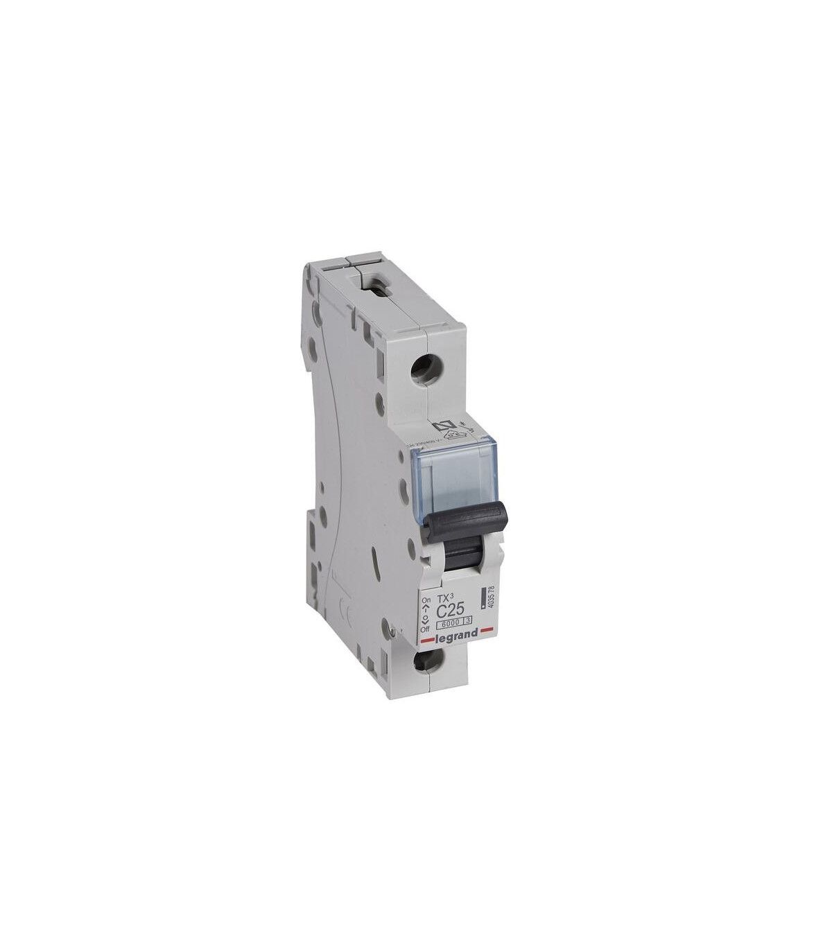 Magnetotérmico TX3 6KA-C 1 polo 25A. Interruptor automático magnetotérmico TX³ Unipolar 230/400 V~ - Curva C - Intensidad nominal: 25A - Número de módulos: 1. magnetotérmicos TX³ - interruptores automáticos de 6A a 40A - curva C - Poder de corte 6000A- Conforme a UNE EN-60898-1 - Conexión con bornas protegidas contra los contactos directos (IP20) - Tornillos imperdibles - Portaetiquetas incorporado - Capacidad de embornamiento: 25 mm² flexible/35 mm² rígido - Se pueden equipar con mandos motorizados y auxiliares de mando y señalización DX³ . El magnetotérmico TX³ 6kA-C 1P 25A de Legrand es un interruptor automático diseñado para proteger instalaciones eléctricas frente a sobrecargas y cortocircuitos. Su tecnología térmico-magnética garantiza una actuación rápida y fiable ante cualquier fallo eléctrico, asegurando la seguridad de viviendas, oficinas e instalaciones industriales. Con una capacidad de interrupción de 6 kA, ofrece un alto nivel de protección incluso en redes con corrientes