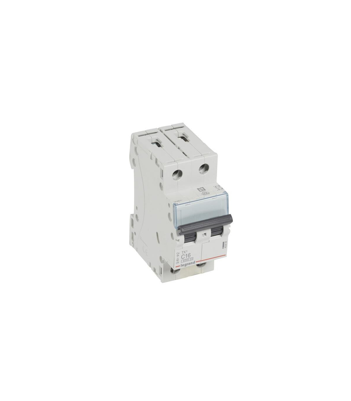 Magnetotérmico TX3 6KA-C 2 polos 16A. Interruptor automático magnetotérmico TX³ Bipolar 230/400 V~ - Curva C - Intensidad nominal: 16A - Número de módulos: 2. magnetotérmicos TX³ - interruptores automáticos de 6A a 40A - curva C - Poder de corte 6000A- Conforme a UNE EN-60898-1 - Conexión con bornas protegidas contra los contactos directos (IP20) - Tornillos imperdibles - Portaetiquetas incorporado - Capacidad de embornamiento: 25 mm² flexible/35 mm² rígido - Se pueden equipar con mandos motorizados y auxiliares de mando y señalización DX³ . El magnetotérmico TX3 2P C 16 A de Legrand, con poder de corte de 6 kA, está diseñado para proteger instalaciones eléctricas frente a sobrecargas y cortocircuitos en circuitos bipolares. Su tecnología avanzada garantiza un disparo rápido y fiable ante cualquier anomalía, protegiendo tanto los conductores como los equipos conectados, asegurando la seguridad y continuidad del suministro eléctrico en entornos residenciales, comerciales o industriales.