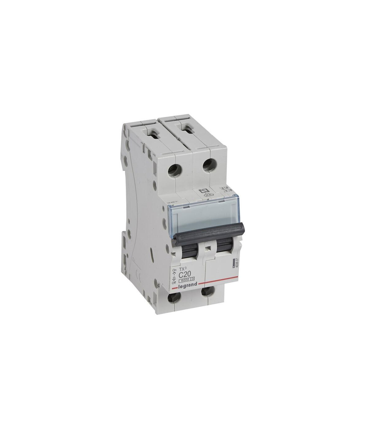 Magnetotérmico TX3 6KA-C 2 polos 20A. Interruptor automático magnetotérmico TX³ Bipolar 230/400 V~ - Curva C - Intensidad nominal: 20A - Número de módulos: 2. magnetotérmicos TX³ - interruptores automáticos de 6A a 40A - curva C - Poder de corte 6000A- Conforme a UNE EN-60898-1 - Conexión con bornas protegidas contra los contactos directos (IP20) - Tornillos imperdibles - Portaetiquetas incorporado - Capacidad de embornamiento: 25 mm² flexible/35 mm² rígido - Se pueden equipar con mandos motorizados y auxiliares de mando y señalización DX³ . El magnetotérmico TX3 2P C 20 A de Legrand, con poder de corte de 6 kA, está diseñado para proteger instalaciones eléctricas frente a sobrecargas y cortocircuitos en circuitos monofásicos o bipolares. Su tecnología avanzada asegura un disparo rápido y fiable ante cualquier anomalía, protegiendo tanto los conductores como los equipos conectados, garantizando la seguridad y la continuidad del suministro eléctrico en entornos residenciales, comerciale