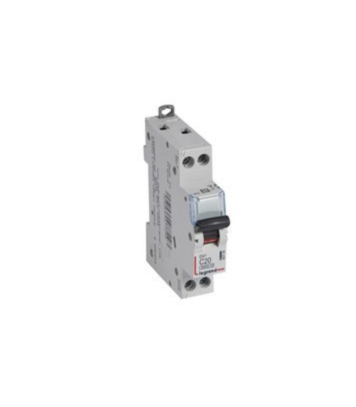 Magnetotérmico DX3 6/10KA polos+neutro C20 1 módulo. Unipolar + neutro 230 V~ - Curva C - Intensidad nominal: 20A - Número de módulos: 1. MCB DX³ 6000 - 10 kA - interruptores automáticos magnetotérmicos de 1A a 63A - curvas C, B y D - Admiten la conexión con peines unipolares y peines multipolares Poder de corte: - 6000 - IEC 60898-1 - 400 V~ - 10 kA - IEC 60947-2 - 400 V~ - Productos con marca N (excepto 1P+N 2 módulos y curva B) - Se pueden equipar con bloques diferenciales, mandos motorizados y auxiliares de mando y señalización DX³ - Portaetiquetas incorporado. El Magnetotérmico DX3 6/10kA P N C20 de Legrand está diseñado para proteger los circuitos eléctricos frente a sobrecargas y cortocircuitos, garantizando la seguridad de los equipos y las personas. Con una corriente nominal de 20 A y un disparo tipo C, es ideal para circuitos residenciales y comerciales, asegurando protección eficiente en iluminación, tomas de corriente y pequeños electrodomésticos.Este magnetotérmico de 1 mó