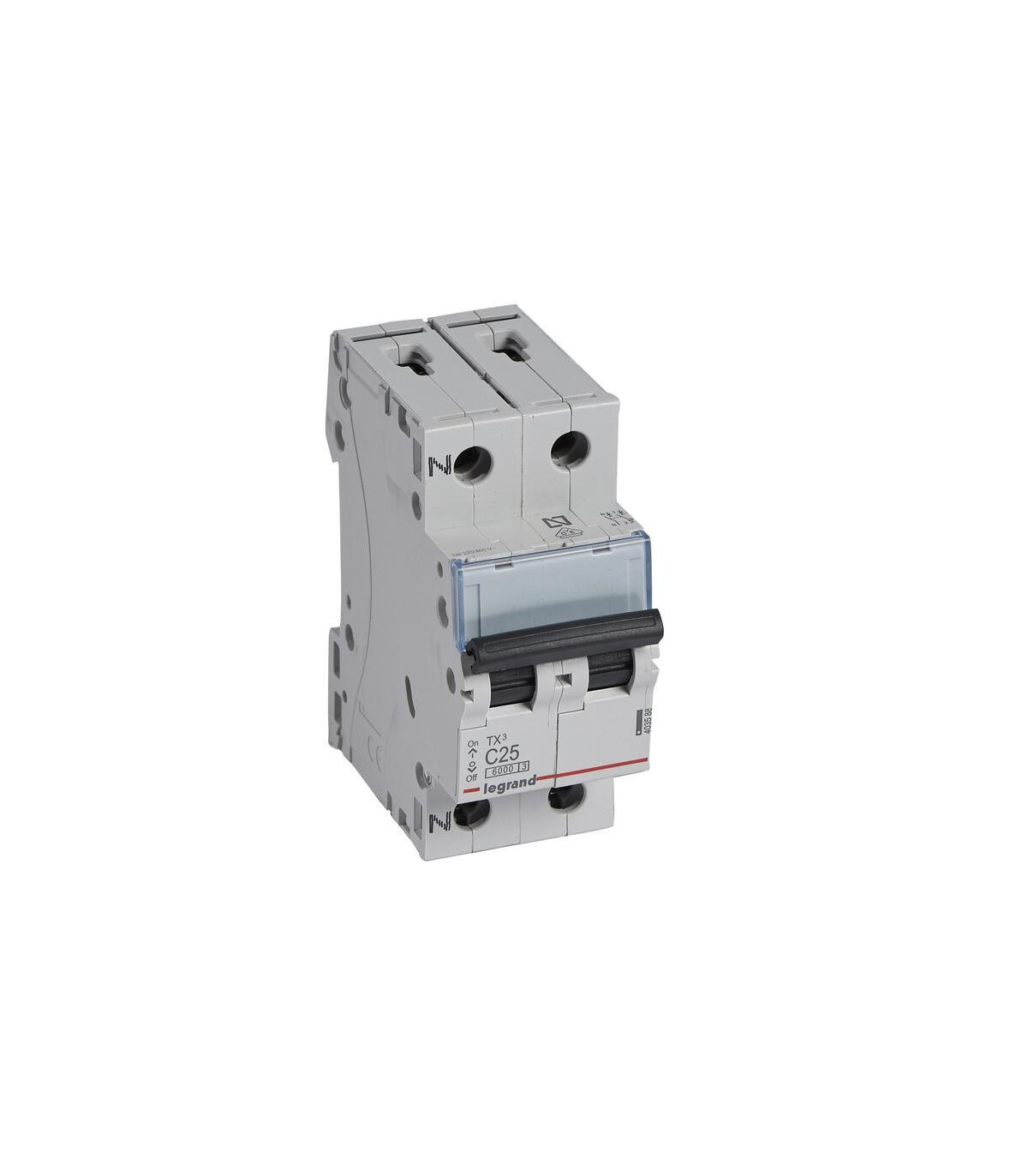 Magnetotérmico TX3 6KA-C polos+neutro 25A. Interruptor automático magnetotérmico TX³ Unipolar + neutro 230 V~ - Curva C - Intensidad nominal: 25A - Número de módulos: 2. magnetotérmicos TX³ - interruptores automáticos de 6A a 40A - curva C - Poder de corte 6000A- Conforme a UNE EN-60898-1 - Conexión con bornas protegidas contra los contactos directos (IP20) - Tornillos imperdibles - Portaetiquetas incorporado - Capacidad de embornamiento: 25 mm² flexible/35 mm² rígido - Se pueden equipar con mandos motorizados y auxiliares de mando y señalización DX³ . El magnetotérmico TX³ 6kA-C P+N 25A de Legrand es un interruptor automático diseñado para proteger instalaciones eléctricas frente a sobrecargas y cortocircuitos. Su tecnología térmico-magnética garantiza una actuación rápida y fiable ante cualquier fallo eléctrico, asegurando la seguridad de hogares, oficinas e instalaciones industriales. Con una capacidad de interrupción de 6 kA, proporciona un alto nivel de protección incluso en redes