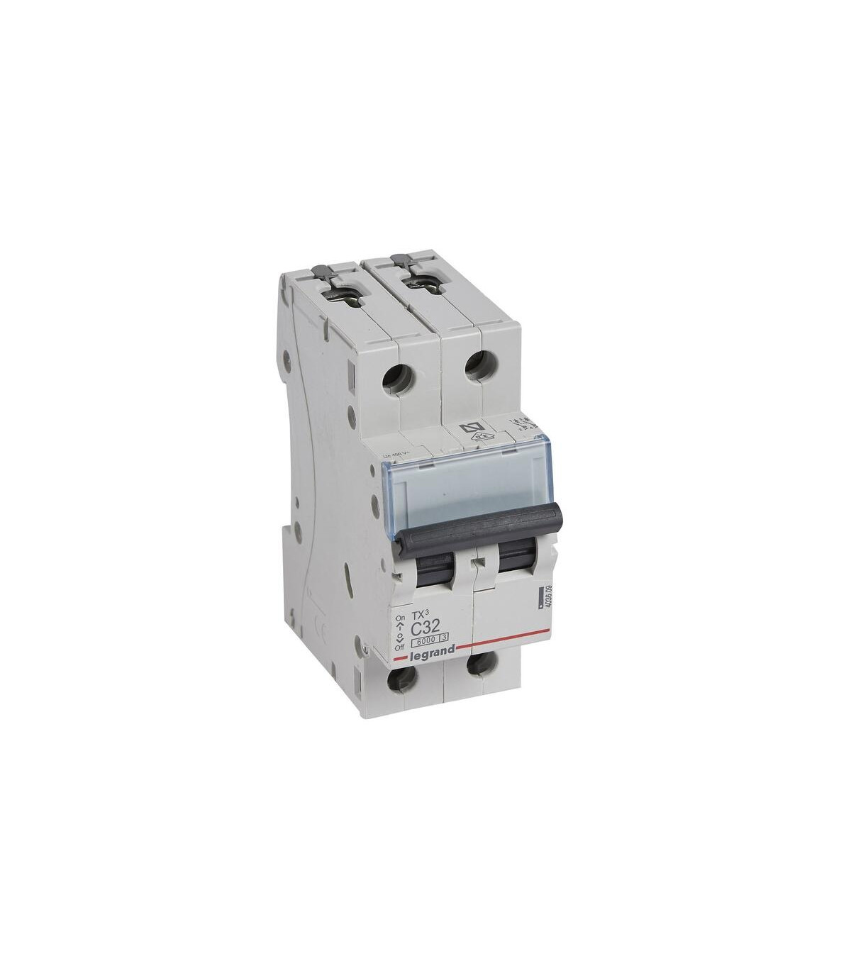 Magnetotérmico TX3 6KA-C 2 polos 32A. Interruptor automático magnetotérmico TX³ Bipolar 230/400 V~ - Curva C - Intensidad nominal: 32A - Número de módulos: 2. magnetotérmicos TX³ - interruptores automáticos de 6A a 40A - curva C - Poder de corte 6000A- Conforme a UNE EN-60898-1 - Conexión con bornas protegidas contra los contactos directos (IP20) - Tornillos imperdibles - Portaetiquetas incorporado - Capacidad de embornamiento: 25 mm² flexible/35 mm² rígido - Se pueden equipar con mandos motorizados y auxiliares de mando y señalización DX³ . El magnetotérmico TX³ 6kA-C 2P 32A de Legrand es un interruptor automático diseñado para proteger instalaciones eléctricas frente a sobrecargas y cortocircuitos. Su tecnología térmico-magnética permite una actuación rápida y fiable ante cualquier fallo eléctrico, garantizando la seguridad de viviendas, oficinas e instalaciones industriales. Con una capacidad de interrupción de 6 kA, asegura un alto nivel de protección incluso en redes con corriente