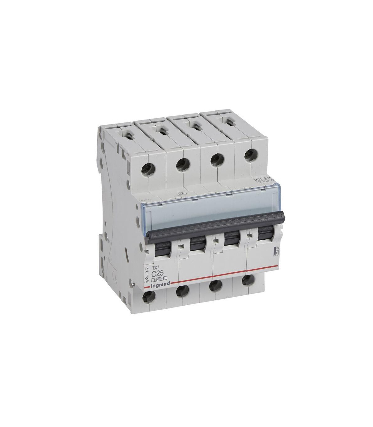Magnetotérmico TX3 6KA-C 4 polos 25A. Interruptor automático magnetotérmico TX³ Tetrapolar 400 V~ - Curva C - Intensidad nominal: 25A - Número de módulos: 4. magnetotérmicos TX³ - interruptores automáticos de 6A a 40A - curva C - Poder de corte 6000A- Conforme a UNE EN-60898-1 - Conexión con bornas protegidas contra los contactos directos (IP20) - Tornillos imperdibles - Portaetiquetas incorporado - Capacidad de embornamiento: 25 mm² flexible/35 mm² rígido - Se pueden equipar con mandos motorizados y auxiliares de mando y señalización DX³ . El magnetotérmico TX3 4P C 25 A de Legrand, con poder de corte de 6 kA, está diseñado para proteger instalaciones eléctricas trifásicas frente a sobrecargas y cortocircuitos. Su tecnología avanzada asegura un disparo rápido y fiable ante cualquier anomalía, protegiendo tanto los conductores como los equipos conectados, garantizando la seguridad y continuidad del suministro eléctrico en entornos residenciales, comerciales o industriales.Fabricado con