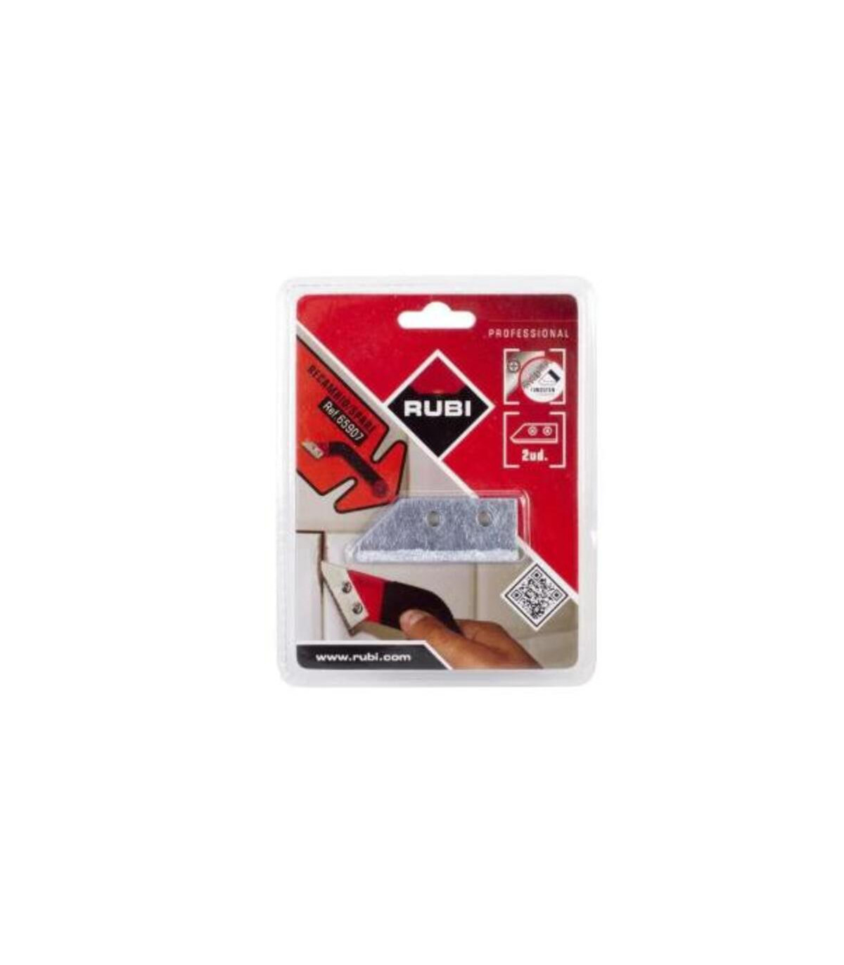 Recambio de rascador para juntas. Completando la amplia gama de rascadores, RUBI pone a disposición de los profesionales varias opciones de rascadores. La primera es el revolucionario rascador eléctrico RUBISCRAPER-250 y su innovadora y patentada cuchilla (producto exclusivo de RUBI). Entre las principales ventajas del RUBISCRAPER-250 destacan: el control de profundidad, su robustez, no genera polvo, auto-guiado y baldosas sin roturas. El recambio rascador para juntas de Rubi está diseñado para reemplazar de manera rápida y eficiente la hoja de rascado de herramientas utilizadas en la limpieza y acabado de juntas en alicatados y pavimentos. Su formato permite eliminar restos de mortero, silicona o adhesivos de manera precisa, garantizando un acabado limpio y uniforme en cada trabajo. Es una solución práctica y económica para mantener las herramientas siempre en condiciones óptimas.Fabricado con materiales de alta calidad, este recambio ofrece durabilidad y un rendimiento constante incl