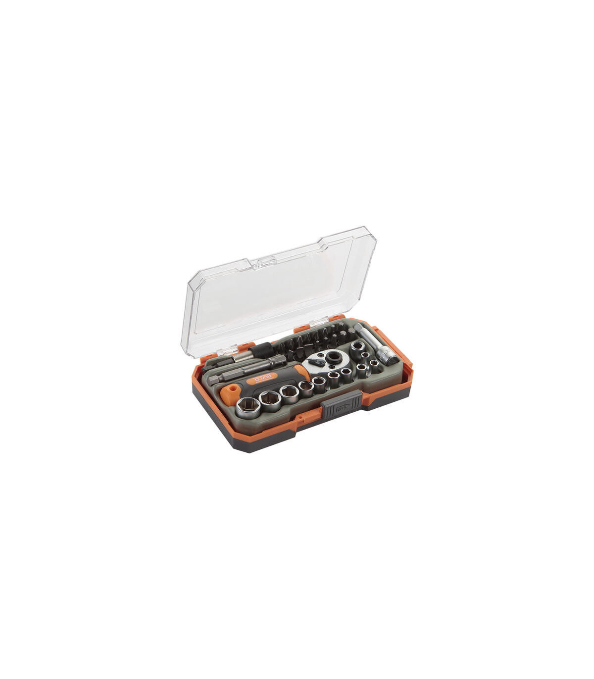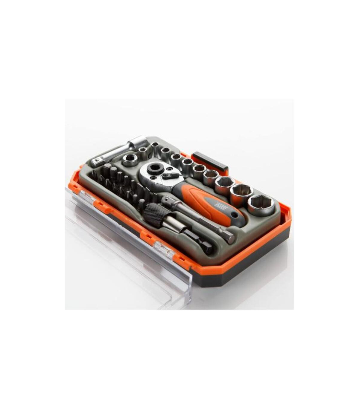 El mini juego de vasos 1/4" de 31 piezas Alyco Tools es un completo set diseñado para cubrir una amplia variedad de necesidades en trabajos mecánicos y de bricolaje. Incluye vasos de diferentes medidas, perfectamente organizados, que permiten ajustar y aflojar tuercas y tornillos con precisión, ofreciendo versatilidad en espacios reducidos donde otras herramientas no llegan. Fabricados en acero de alta calidad, los vasos garantizan durabilidad y resistencia al desgaste, asegurando un rendimiento fiable en el tiempo.Su diseño compacto y ligero facilita el transporte y almacenamiento, ideal tanto para profesionales como para aficionados al bricolaje. El estuche incluido permite mantener todas las piezas ordenadas y al alcance de la mano, evitando pérdidas y mejorando la eficiencia en el trabajo. Este mini juego de vasos es la solución perfecta para quienes buscan un conjunto completo, resistente y práctico que se adapte a diversas aplicaciones y condiciones de trabajo.