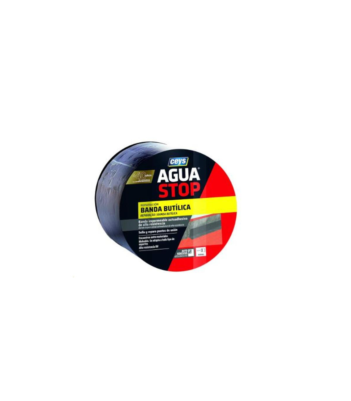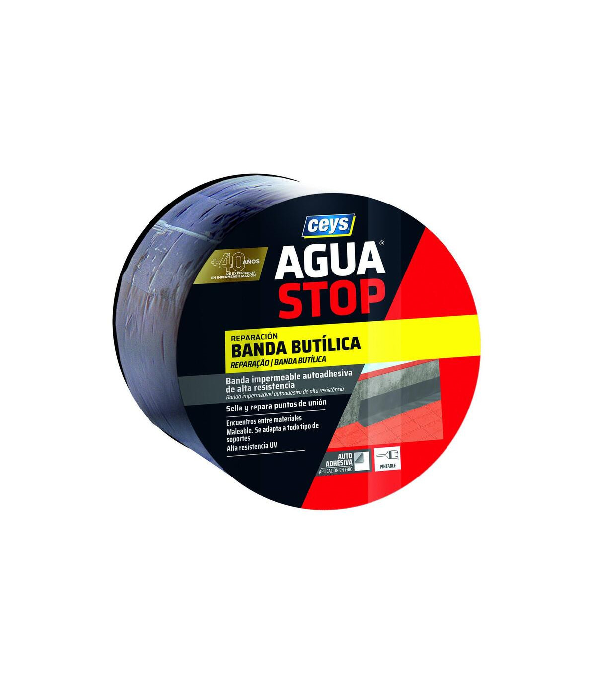 Banda impermeabilizante butílica AGUA STOP 10cm gris 10m (bolsa), autoadhesiva en frío para reforzar zonas de la cubierta y repara grietas y fisuras en seco. 100% Impermeable al agua. Resiste temperaturas extremas Alta resistencia a los rayos UV. Flexible, incluso a bajas temperaturas (hasta -30ºC). Banda butílica impermeabilizante Agua Stop de 10 cm de ancho y 10 m de longitud, en color gris, presentada en bolsa individual por Ceys. Está especialmente diseñada para sellar juntas, grietas y uniones, ofreciendo una protección eficaz contra la filtración de agua.El material butílico de alta calidad garantiza adherencia excelente, flexibilidad y resistencia a la intemperie, proporcionando un sellado duradero tanto en interiores como exteriores. Ideal para reparaciones rápidas y efectivas en tejados, canaletas, tuberías y superficies expuestas a humedad.