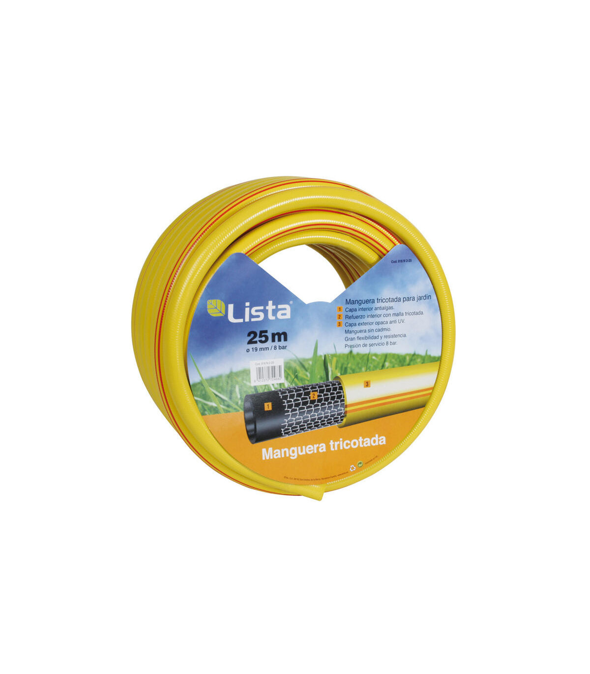 Manguera tricotada de 19 mm de diámetro y 50 metros de longitud, ideal para riego y uso doméstico o profesional. Fabricada con