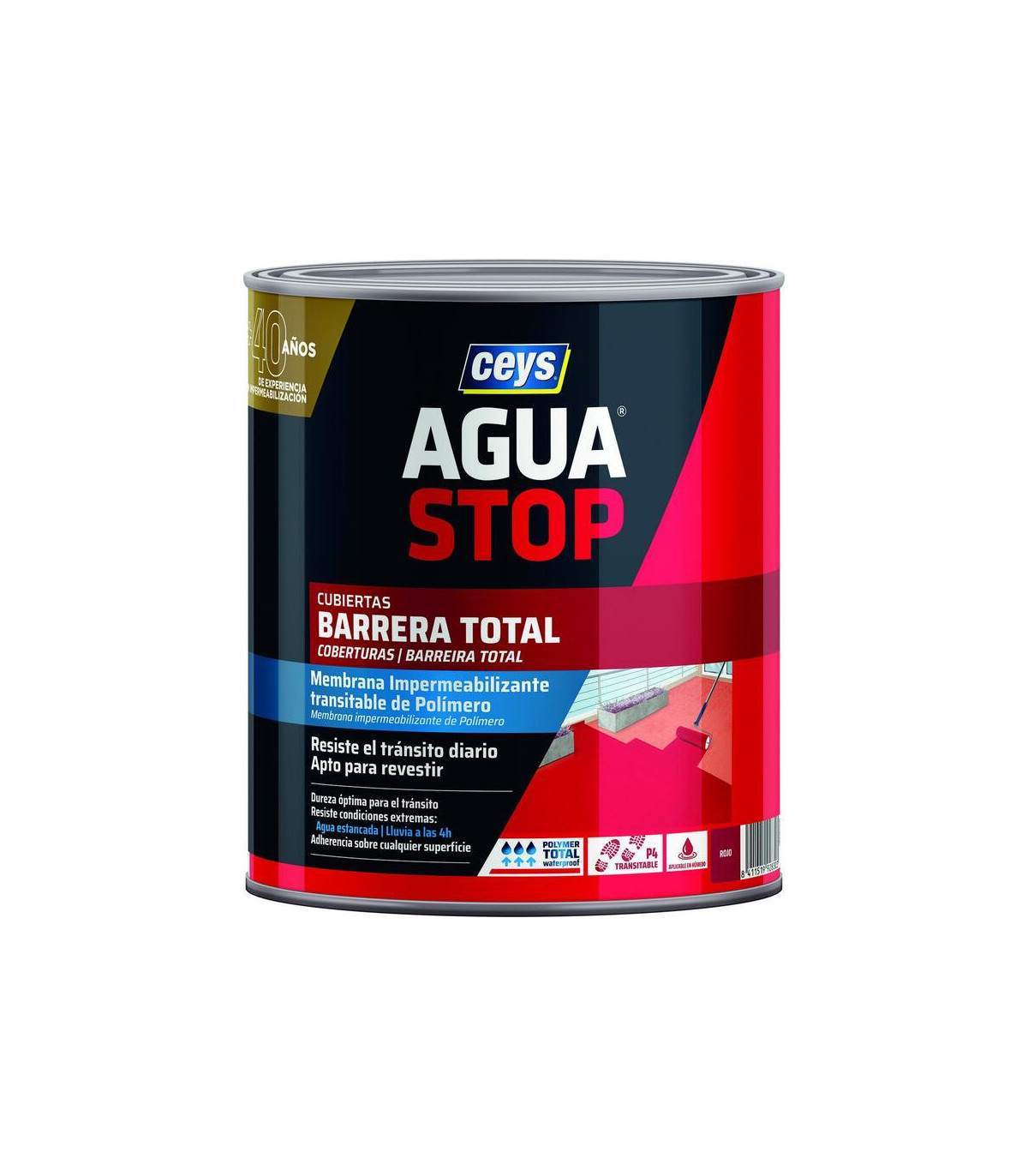 Impermeabilizante AGUA STOP BARRERA TOTAL rojo 1Kg (bote), de altas prestaciones. Resiste a los rayos UV, es transitable y embaldosable. Transitable. Embaldosable. Resiste agua estancada. Aplicable sobre húmedo (hasta un 15%). Resiste el contacto con la lluvia a las 4h. Gran adherencia sobre múltiples materiales. No degradadas Encuentros, desagües y puntos singulares. Anclajes, perforaciones, pasos y protección al óxido de elementos metálicos. Zonas de alta humedad o con climatología adversa. Materiales de difícil adherencia: tela asfáltica con aluminio gofrado, PVC, Vitrificados, esmaltados, policarbonato, baldosín catalán, uralita, gres, cerámica, porcelánico, aluminio, zinc, soleras de mortero, chapas de compresión, etc. Azoteas, Terrados y terrazas transitables. El impermeabilizante Agua Stop Barrera Total Rojo 1Kg de Ceys es una solución de alto rendimiento para proteger superficies expuestas a humedad y filtraciones. Gracias a su tecnología Polymer Total Waterproof, forma una mem