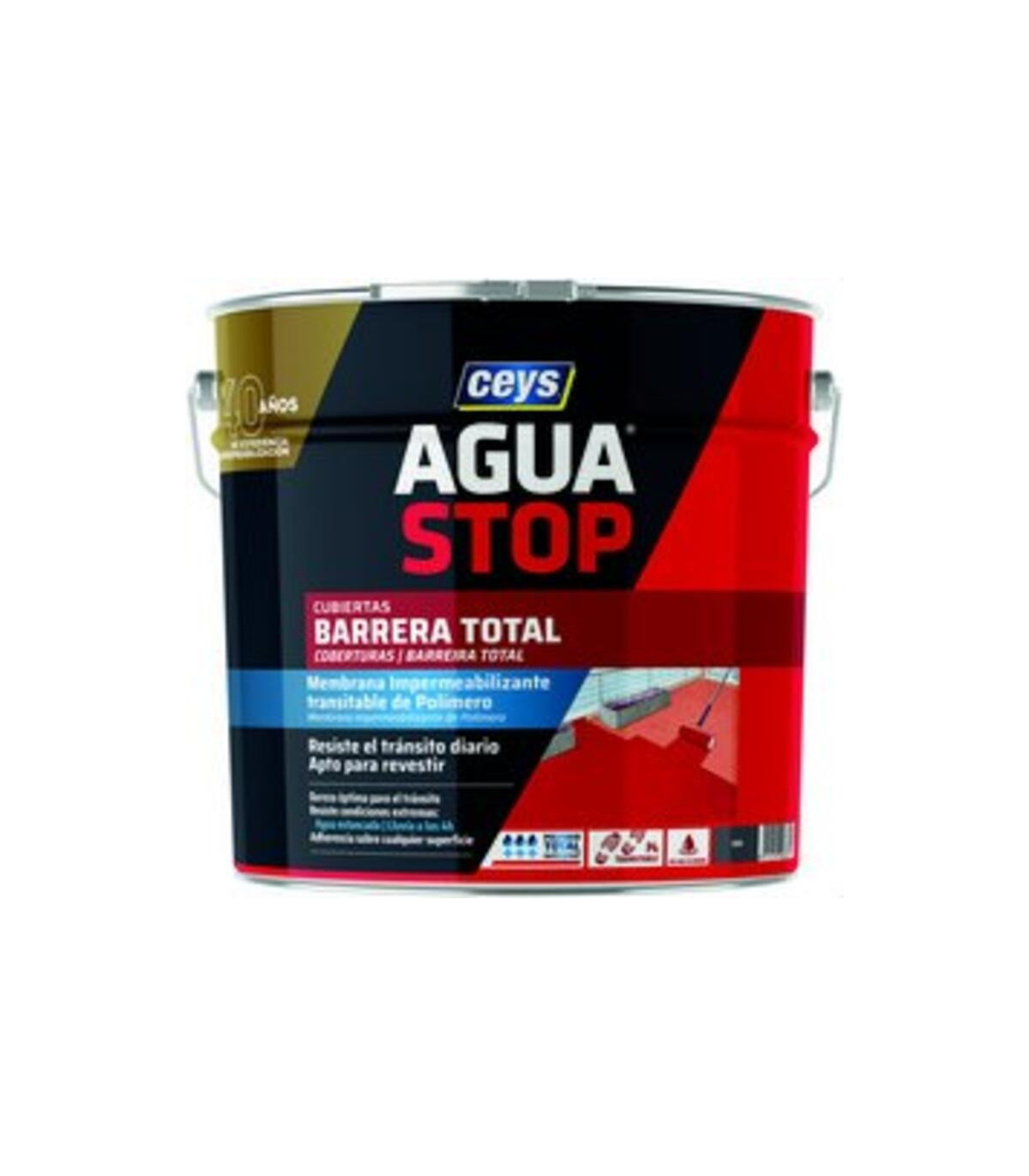 Impermeabilizante AGUA STOP BARRERA TOTAL 4Kg gris (bote), de altas prestaciones. Resiste a los rayos UV, es transitable y embaldosable. Transitable. Embaldosable. Resiste agua estancada. Aplicable sobre húmedo (hasta un 15%). Resiste el contacto con la lluvia a las 4h. Gran adherencia sobre múltiples materiales. No degradadas Encuentros, desagües y puntos singulares. Anclajes, perforaciones, pasos y protección al óxido de elementos metálicos. Zonas de alta humedad o con climatología adversa. Materiales de difícil adherencia: tela asfáltica con aluminio gofrado, PVC, Vitrificados, esmaltados, policarbonato, baldosín catalán, uralita, gres, cerámica, porcelánico, aluminio, zinc, soleras de mortero, chapas de compresión, etc. Azoteas, Terrados y terrazas transitables. El impermeabilizante Agua Stop Barrera Total de Ceys, en bote de 4 kg y color gris, está diseñado para ofrecer una protección completa contra filtraciones y humedades en superficies de construcción. Su fórmula avanzada crea