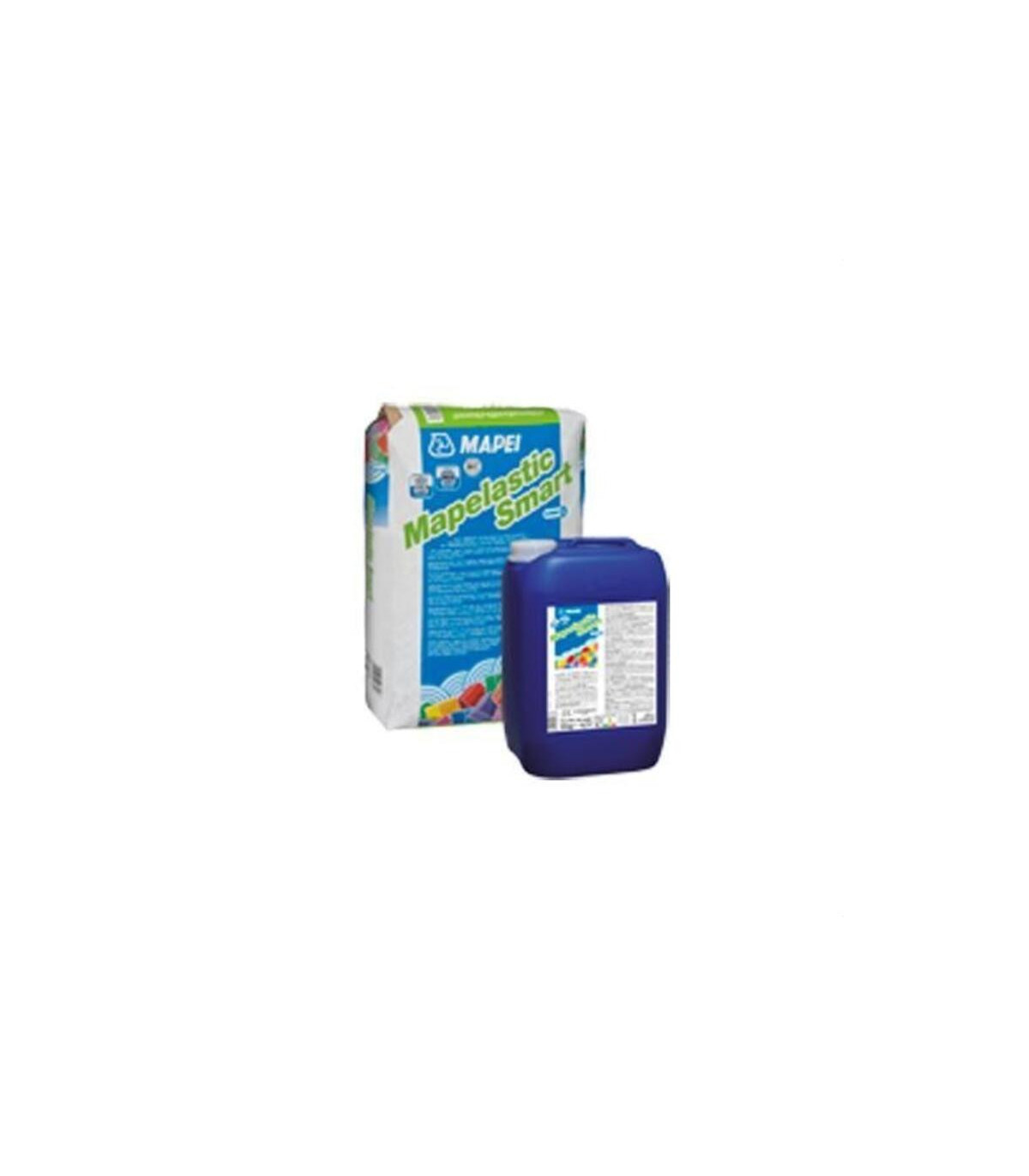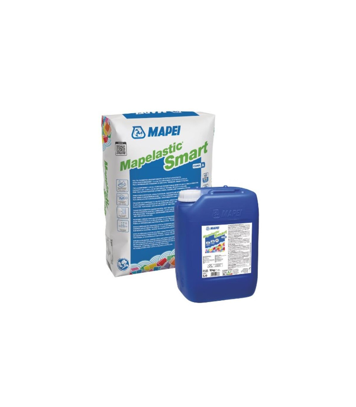 Mortero cementoso, bicomponente, de elevada elasticidad, para aplicar a brocha o rodillo, para la impermeabilización de superficies de hormigón como balcones, terrazas, baños y piscinas y para la protección contra los agentes agresivos. Se suministra en unidades de 30 kg: sacos de 20 kg + garrafas de 10 kg. El Mapelastic Smart es un mortero cementoso bicomponente de alta flexibilidad, diseñado específicamente para la impermeabilización de superficies de hormigón y otras estructuras sujetas a humedad. Este producto de MAPEI se presenta en formato de 20 kg y está compuesto por una mezcla de polímeros especiales y cemento de alta calidad, que al combinarse forman una membrana elástica y resistente al agua. Es ideal para aplicaciones en terrazas, balcones, piscinas, y zonas expuestas a la intemperie, ofreciendo una protección duradera frente a agentes atmosféricos y ciclos de congelación y deshielo.Gracias a su excelente adherencia sobre soportes cementosos y su capacidad para absorber mov