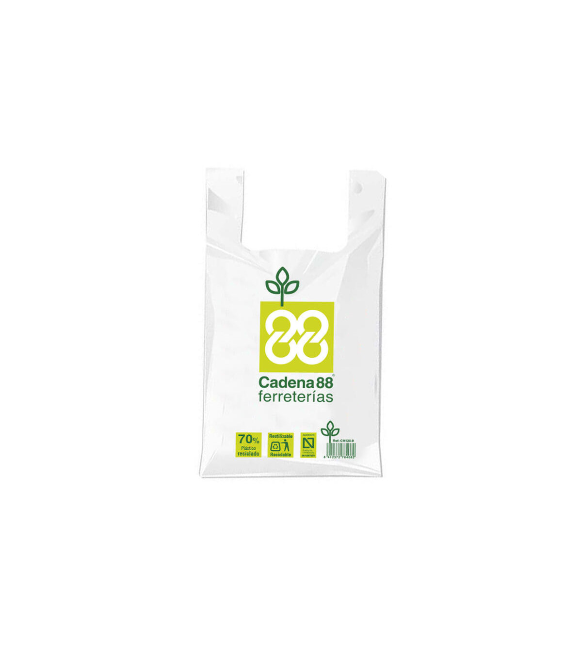 Polietileno de alta densidad 200 gr (50 micras). Fabricada con más de un 70% de material reciclado. Reutilizable. Impresa con tintas ecológicas al agua. Cumple Norma AENOR UNE 53930-2 para uso de bolsas de distribución, de obligatorio cumplimiento a partir de 2021..