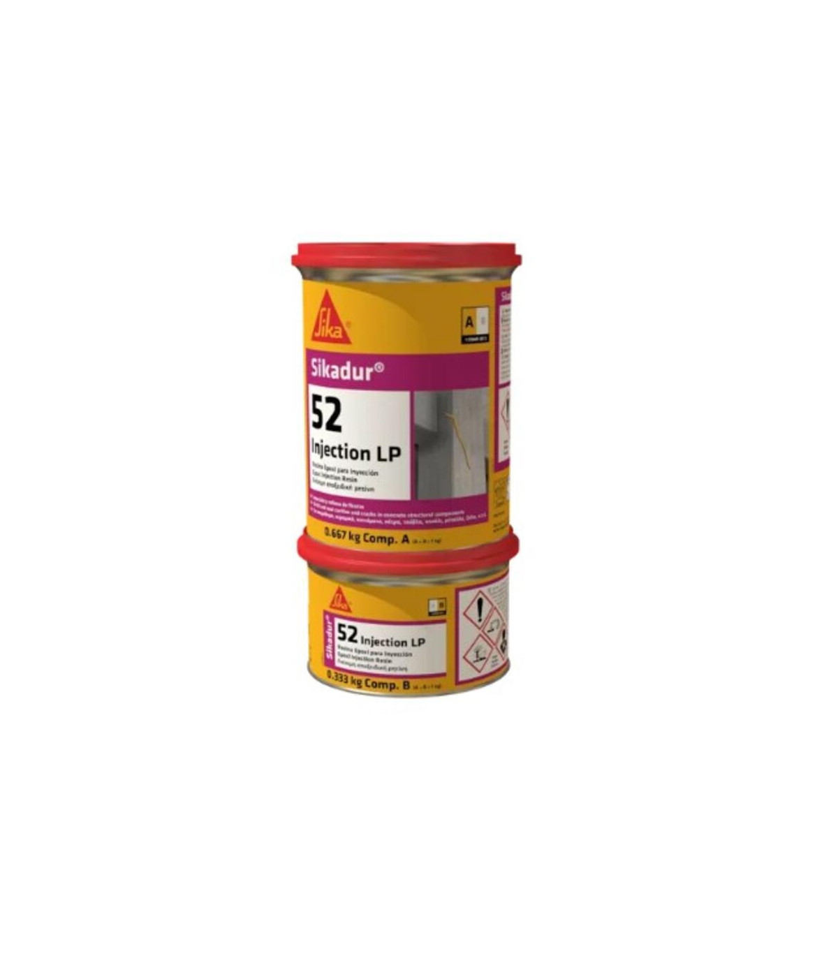 Resina epoxi SikaDur-52 inyección libre de potencial (18kg). Resina de inyección de baja viscosidad. Resina de inyección con buena adherencia a hormigón, mortero, piedra, acero y madera. Sikadur-52 Inyección se usa para rellenar y sellar agujeros y fisuras en estructuras tales como puentes y otro tipo de construcciones civiles e industriales incluyendo pilares, vigas ,cimentaciones, muros, soleras y depósitos. No sólo forma una barrera efectiva frente a las filtraciones de agua y el avance de la corrosión, también pega o une las secciones de hormigón existentes. Sikadur‑52 Inyección es una resina epoxi bicomponente de baja viscosidad, formulada para la inyección y sellado de fisuras y grietas en estructuras de hormigón. Penetra fácilmente en fisuras finas, restaurando la integridad estructural del elemento.