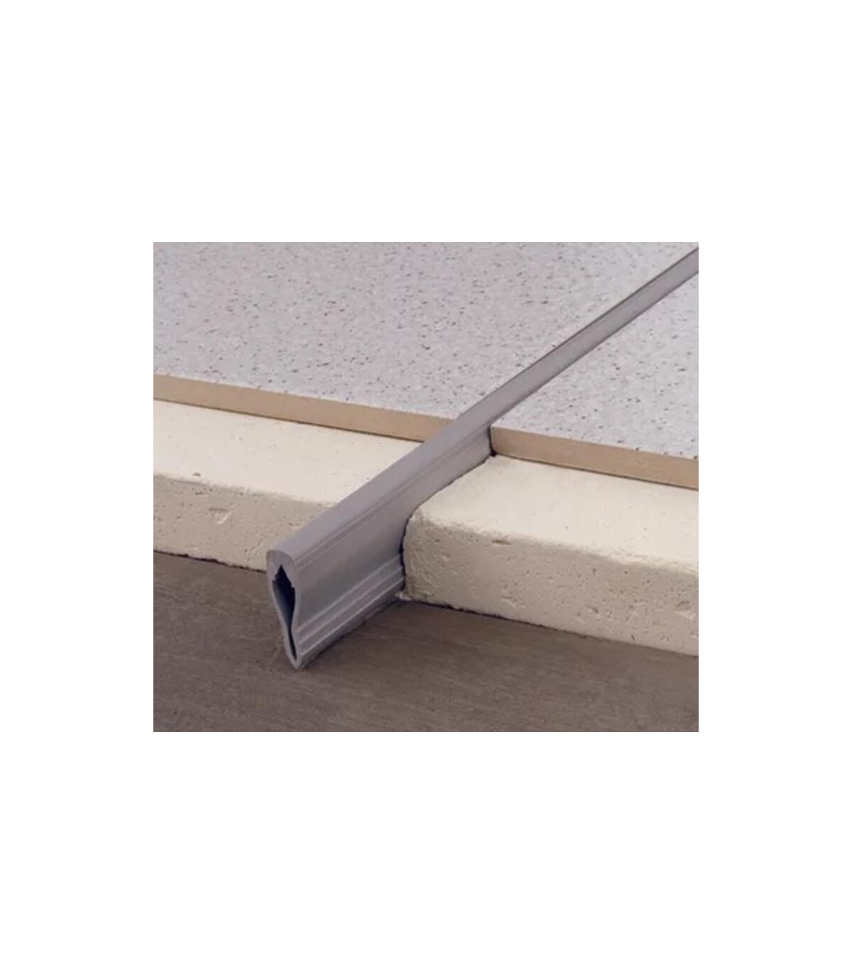 Junta de dilatación prefabricada en forma de flecha para absorber los movimientos de las superficies revestidas Novojunta® 1 de Emac®. Fabricada mediante co-extrusión de PVC color gris Nº 02. Perfil de 2,50 m. de longitud con superficie serrada en el extremo inferior y una altura total de 50 mm, colocado según se indica en la ficha técnica del fabricante.