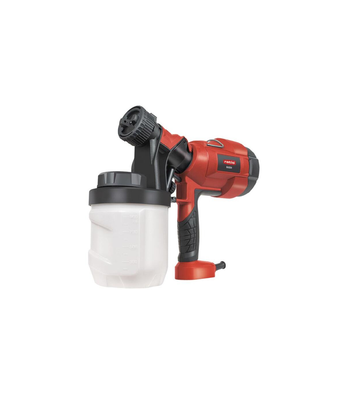 Pistola de pintado RATIO R400X 3 modos de pulverización. 1 recipiente de 900 ml. Apta para pintura plástica, esmaltes, imprimaciones y barnices en todo tipo de trabajo. Incluye 3 boquillas, 1 embudo, 1 cepillo de limpieza, 1 llave y 1 aguja de limpieza. Potencia: 400 W. Depósito: 900 ml. Boquillas: ø 2 mm, ø 2,5 mm, ø 3 mm. Viscosidad máx: 70 DIN/s. Flujo pulverización: 800 ml/min.