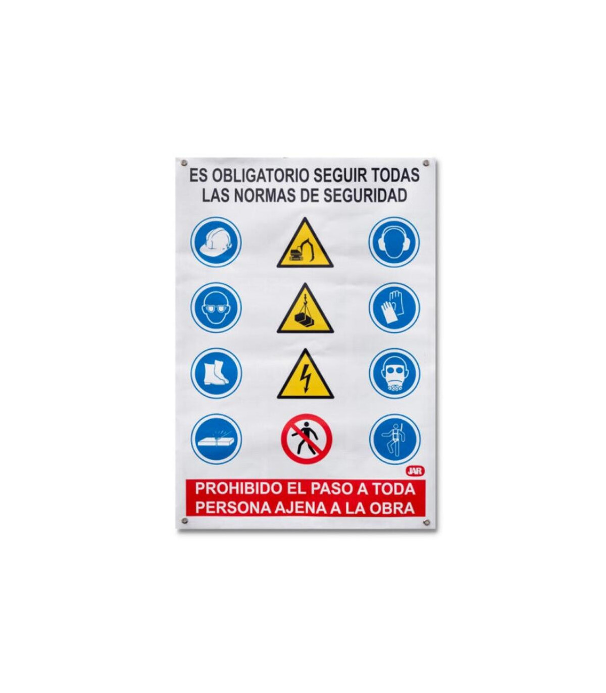 El cartel combinado de lona horizontal de 100×68 cm és una solució resistent i molt visible per a senyalització temporal o permanent en obres, espais industrials i zones d’accés restringit. Fabricat en lona reforçada, ofereix una gran durabilitat en exteriors i una excel·lent resistència a la intempèrie. El disseny combinat integra diversos pictogrames o avisos en un sol panell, facilitant la comunicació clara i immediata. És ideal per complir normatives de seguretat i millorar la informació en entorns professionals.