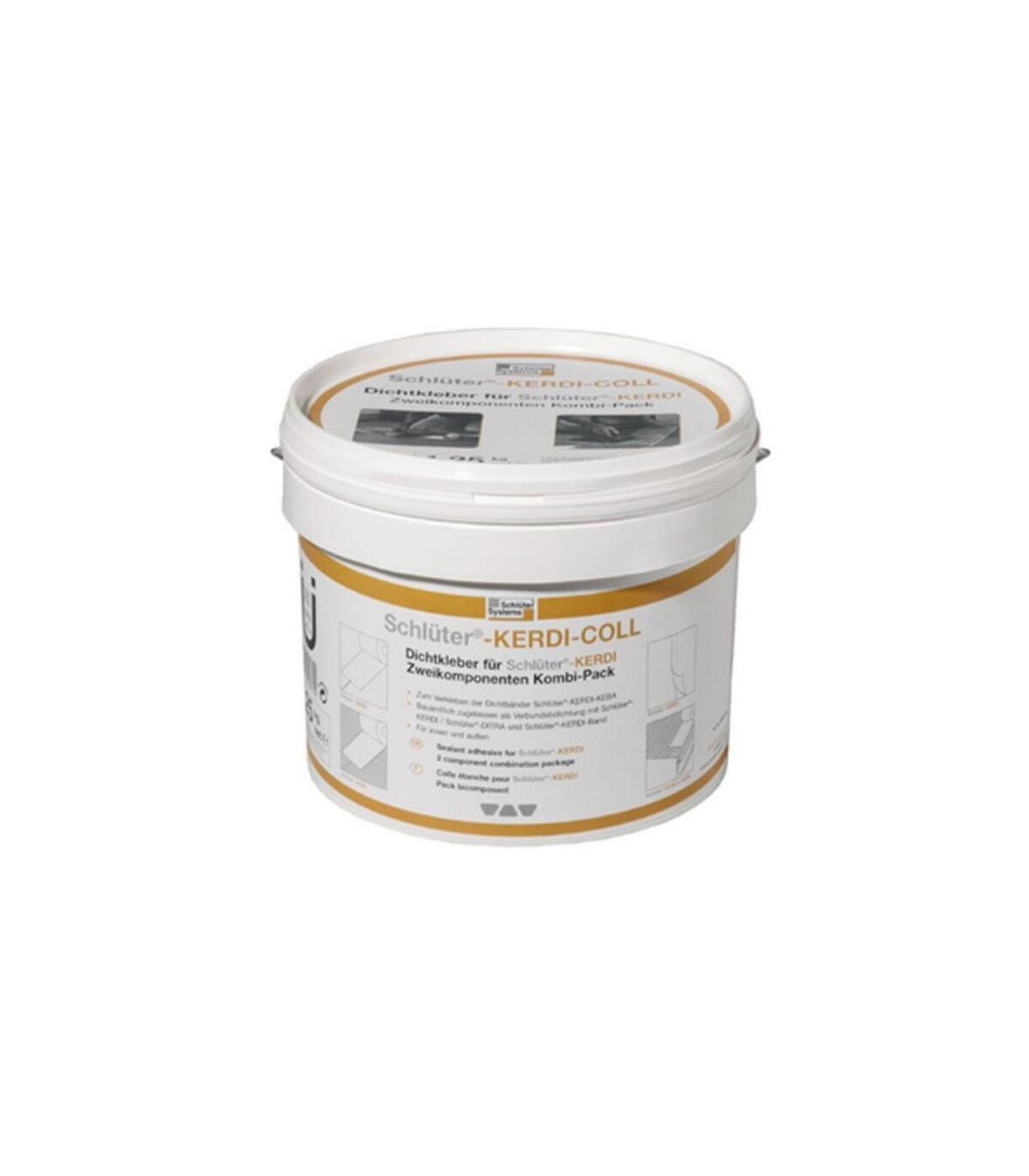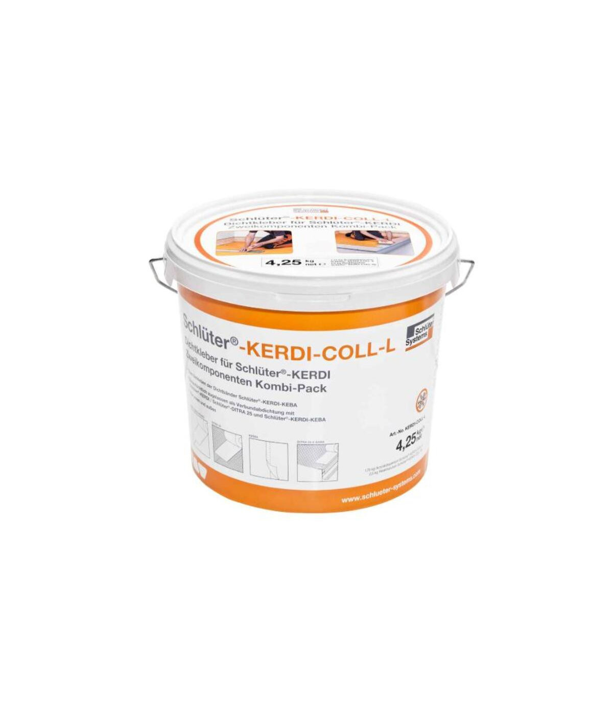 Kerdi-Coll es un adhesivo bicomponente en base de una dispersión acrílica sin disolventes y un polvo de reacción en base cemento. Es apto para la adhesión e impermeabilización de los solapes de la lámina Kerdi, además con Kerdi-Coll se puede realizar la colocación impermeable de las bandas de Schlüter-Kerdi-Keba en las juntas de unión y entrega sobre la lámina.
