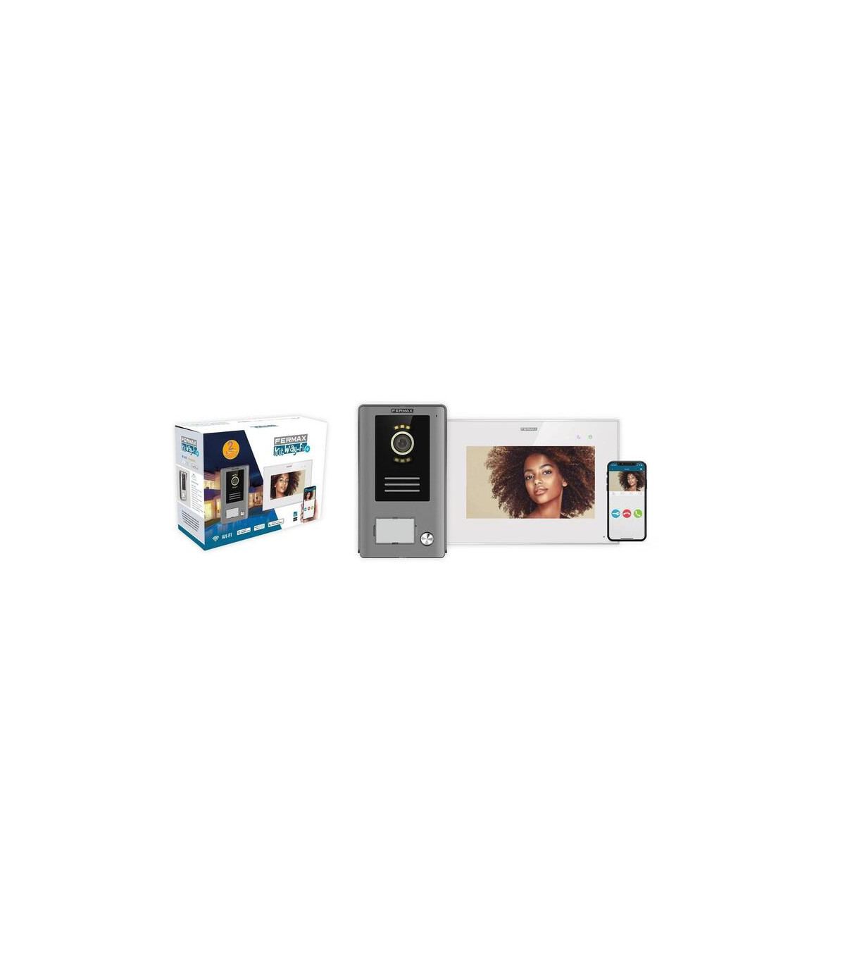PRINCIPALES CARACTERÍSTICAS Instalación de 2 hilos no polarizados. Cámara de video con alta calidad de imagen, incluso nocturna. Compatible con altavoces y pantallas Inteligentes: ALEXA y GOOGLE HOME, para recibir las notificaciones de llamada en el altavoz o pantalla inteligente y poder hablar, visualizar la imagen y usar comandos de voz para abrir la puerta. Con GOOGLE HOME el comando de apertura de puerta sólo activa la puerta principal. Proceso de emparejamiento sencillo mediante Código QR. Apertura directa de la puerta desde el móvil (mediante código de seguridad opcional), sin necesidad de auto-on. Opción de widget o atajo. Captura y visualización de fotos/vídeos desde el monitor o móvil. Integración con cámaras IP Wifi FERMAX ref. 9986 (visualización desde monitor y móvil. Alarmas de detección de movimiento). Activación de función adicional F1 desde el monitor o la APP. Llamada desde APP a vivienda (con opción modo escucha). Sin límite de usuarios en APP. Gestión de varios kits