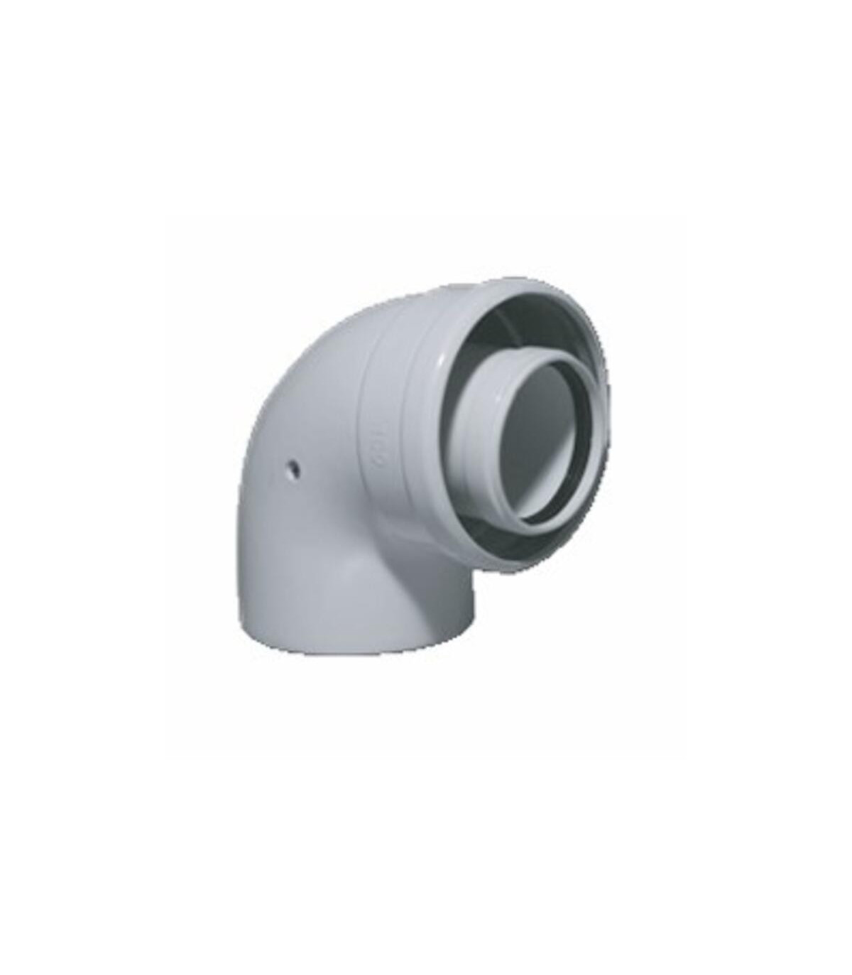 Codo M-H diámetro 60/100 90 PPS aluminio caldera condensación. Aparatos serie CONDENSACIÓN COAXIAL tradicionales de instalación individual y batería o cascada en interiores mural estanca. Combustible: Gas. Temperatura máxima: 120ºC. Materiales: Tubería coaxial de Aluminio (cond. exteriores) y PPs (conductos interiores) pintada en poliéster blanco. Juntas EPDM. Conducción de humos en aparatos de condensación cámara estanca. Característica básica autoextinguible. Facilidad para la toma de muestras. Diversidad de adaptadores a caldera. El Codo M-H diámetro 60/100 90° PPS aluminio (referencia CCDMH90100) de Dismol es un accesorio diseñado para cambiar la dirección de los conductos en sistemas de evacuación de calderas de condensación, garantizando un flujo eficiente de gases de combustión y aire de aporte. Su diseño coaxial M-H permite una instalación segura y estanca, adaptándose a las necesidades de calderas modernas que requieren un manejo óptimo de temperatura y presión.Fabricado con m
